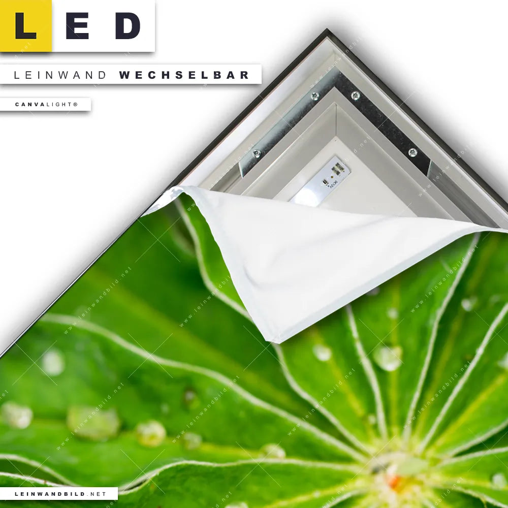 Du bist auf der Suche nach einem Blumen - Botanik LED Leinwandbild im Querformat? Begriffe wie Pflanze, Natur, Nahaufnahme, Draufsicht, Blatt, Blätter, Tropfen, Wassertropfen haben Dich auf der Suche nach Deinem neuen XXL LED Wandbild mit wechselbarer Leinwand inspiriert? Farben wie Grün dürfen auf Deinem neuen breiten Leinwand-LED-Bild nicht fehlen und Leuchtbilder im Floral, Natürlich - Realistisch Stil passen perfekt zu Deinem Einrichtungsstil?