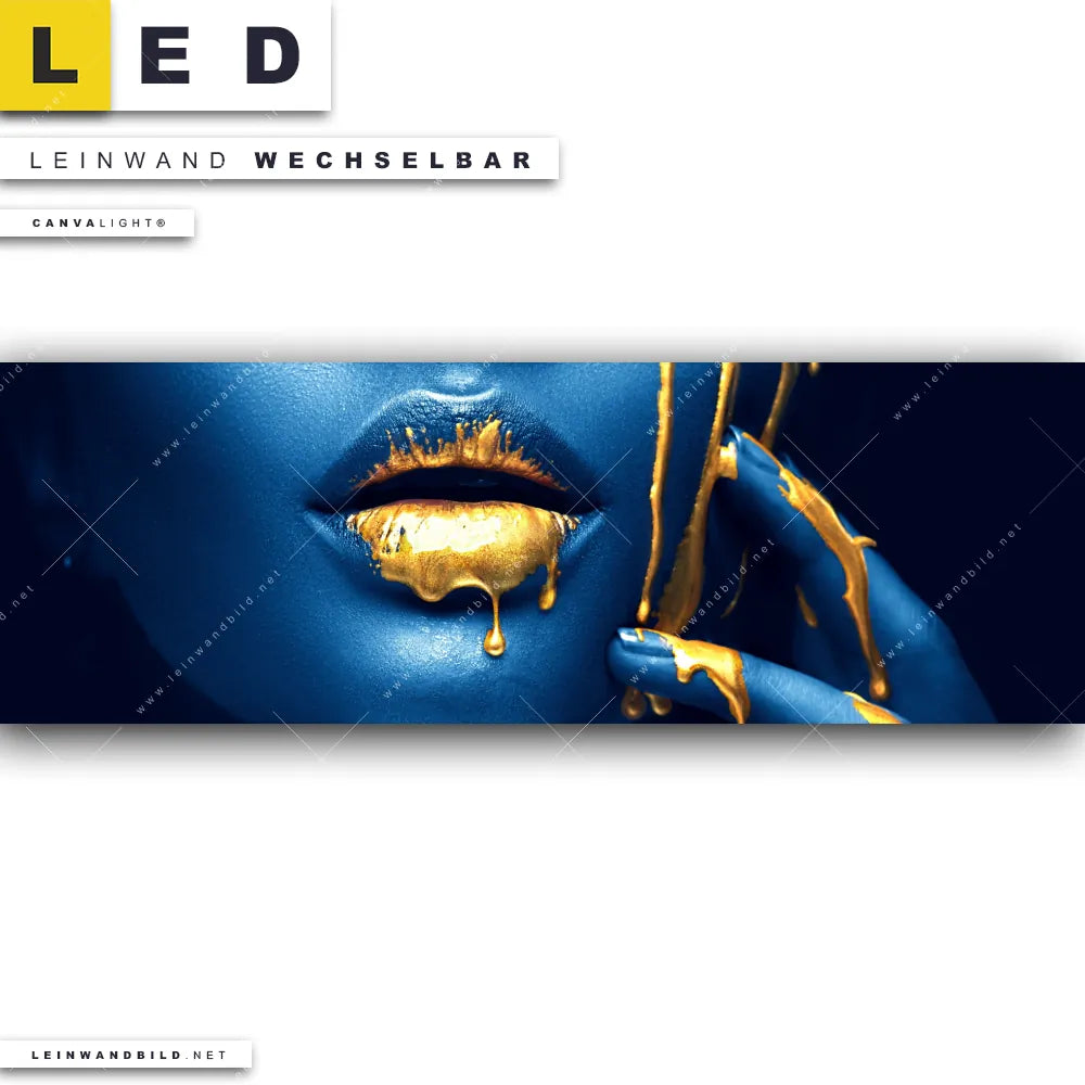 Du bist auf der Suche nach einem Porträts - Menschen LED Leinwandbild im Panorama-Format? Begriffe wie Frau, Lippen, Mund, Farbe, Beauty haben Dich auf der Suche nach Deinem neuen XXL LED Wandbild mit wechselbarer Leinwand inspiriert? Farben wie Gold, Blau dürfen auf Deinem neuen extra breiten Leinwand-LED-Bild nicht fehlen und Leuchtbilder im Modern Art Stil passen perfekt zu Deinem Einrichtungsstil?