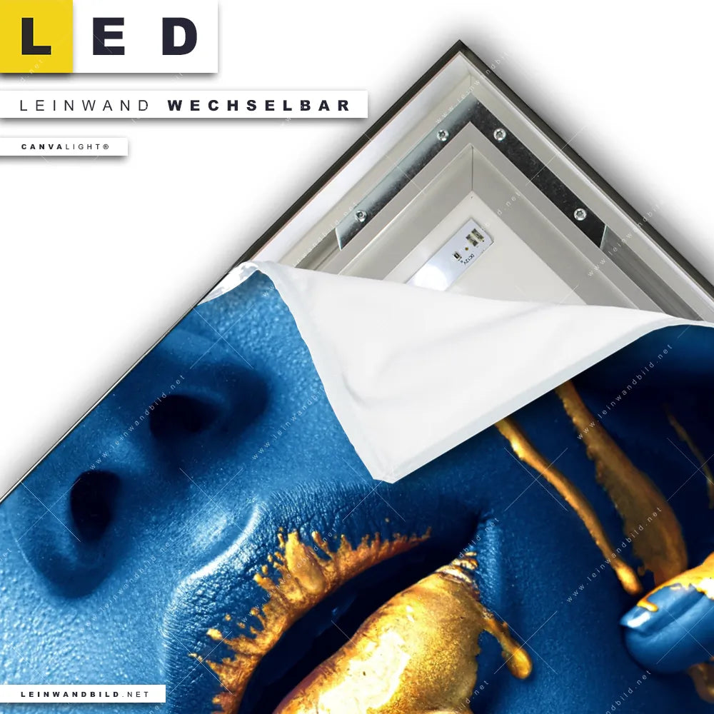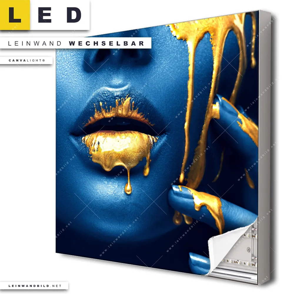 Du bist auf der Suche nach einem Porträts - Menschen LED Leinwandbild im Quadratischen Format? Begriffe wie Frau, Lippen, Mund, Farbe, Beauty haben Dich auf der Suche nach Deinem neuen XXL LED Wandbild mit wechselbarer Leinwand inspiriert? Farben wie Gold, Blau dürfen auf Deinem neuen Leinwand-LED-Bild nicht fehlen und Leuchtbilder im Modern Art Stil passen perfekt zu Deinem Einrichtungsstil?
