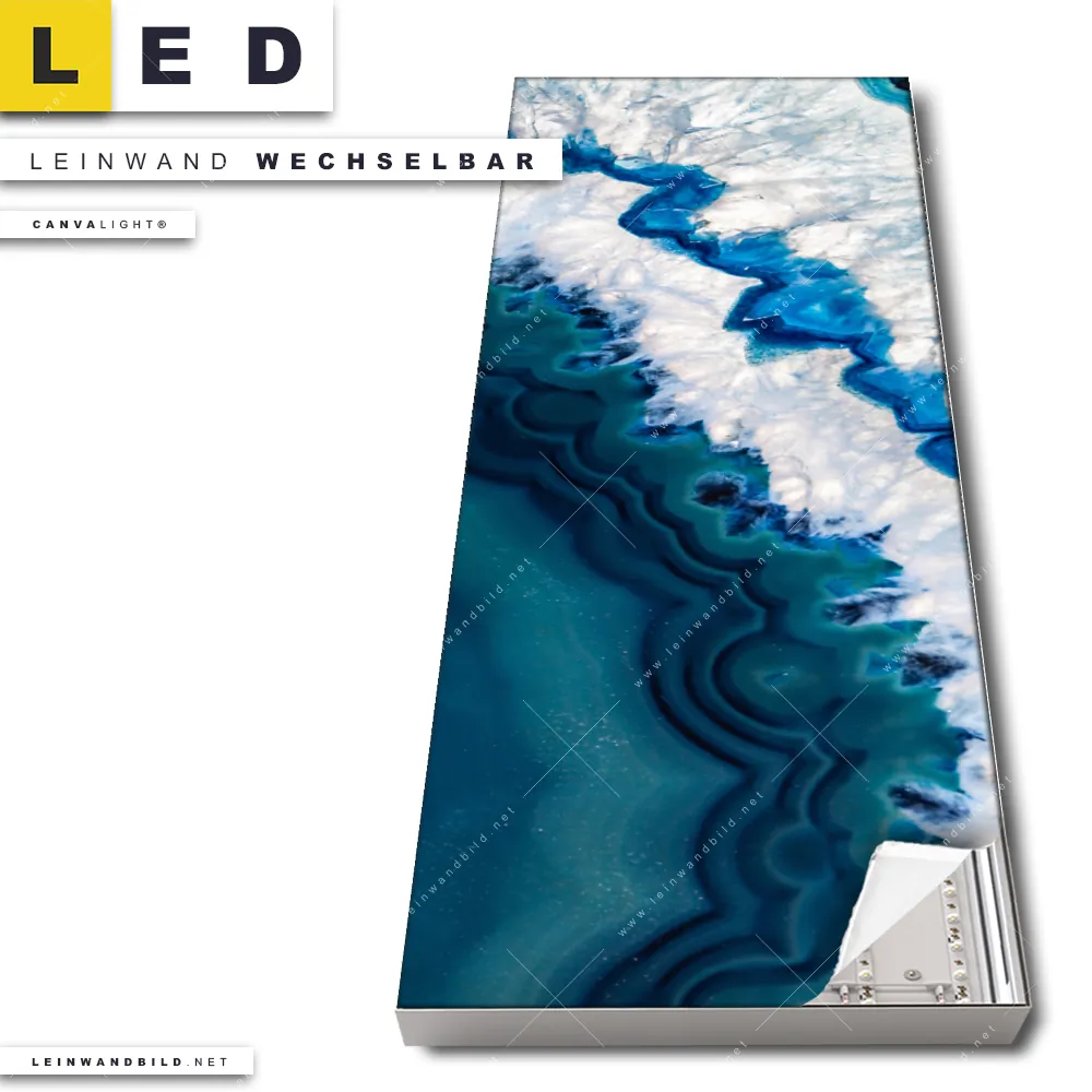 Du konfigurierst Dein individuelles LED Leinwandbild Canvalight® TEX | Blauer Achat | Schmal und wir produzieren es NEU für Dich. Unsere Muster - Texturen LED Bilder mit wechselbarer Textil-Leinwand sind KEINE Lagerware. Du bist Dir unsicher, welches Motiv oder Format das richtige für dein individuelles Canvalight® Leuchtbild ist, dann helfen wir dir gerne weiter und beraten dich!