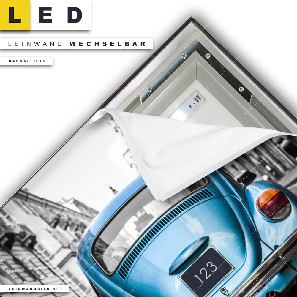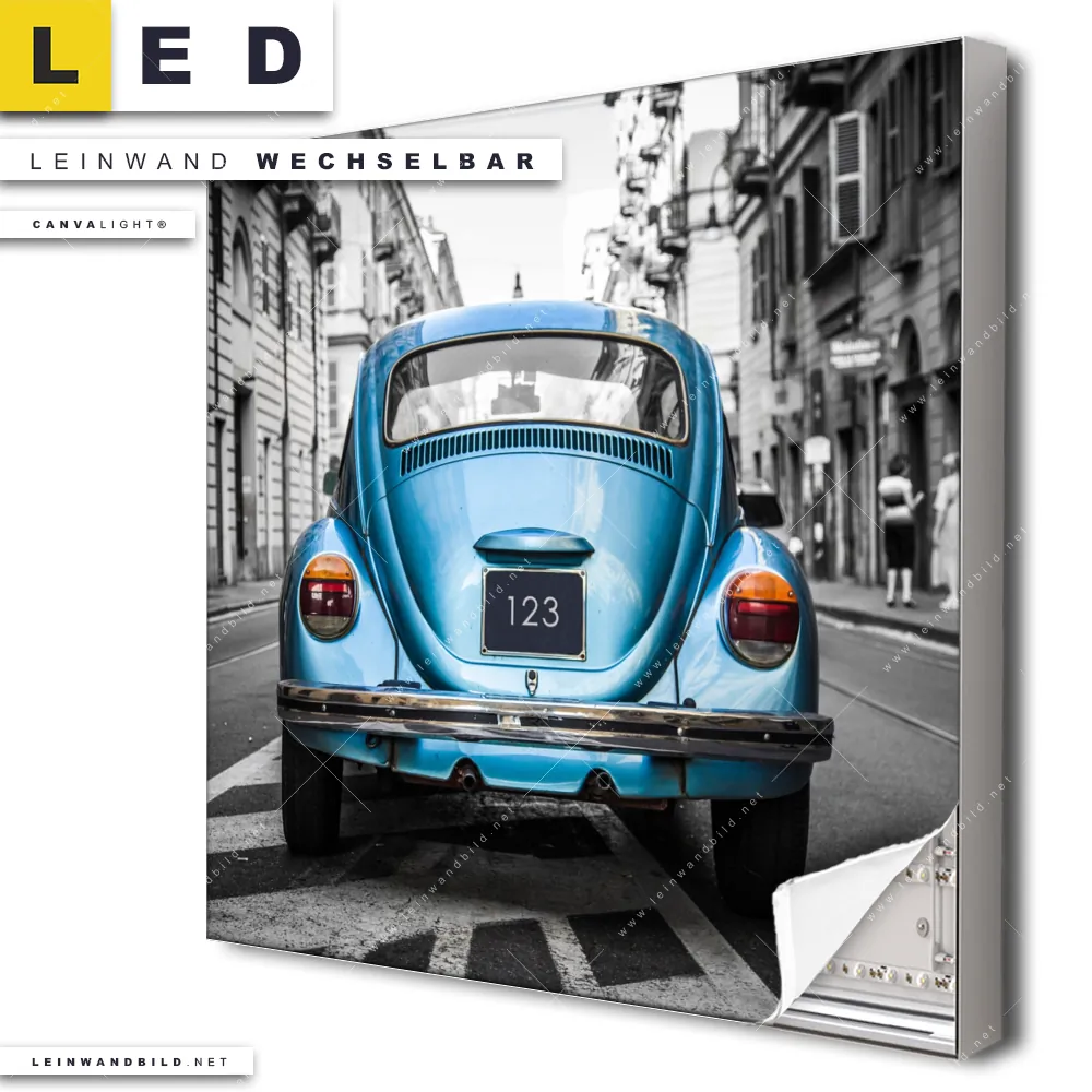 Du konfigurierst Dein individuelles LED Leinwandbild Canvalight® TEX | Blauer Oldtimer | Quadrat und wir produzieren es NEU für Dich. Unsere Fahrzeuge LED Bilder mit wechselbarer Textil-Leinwand sind KEINE Lagerware. Du bist Dir unsicher, welches Motiv oder Format das richtige für dein individuelles Canvalight® Leuchtbild ist, dann helfen wir dir gerne weiter und beraten dich!
