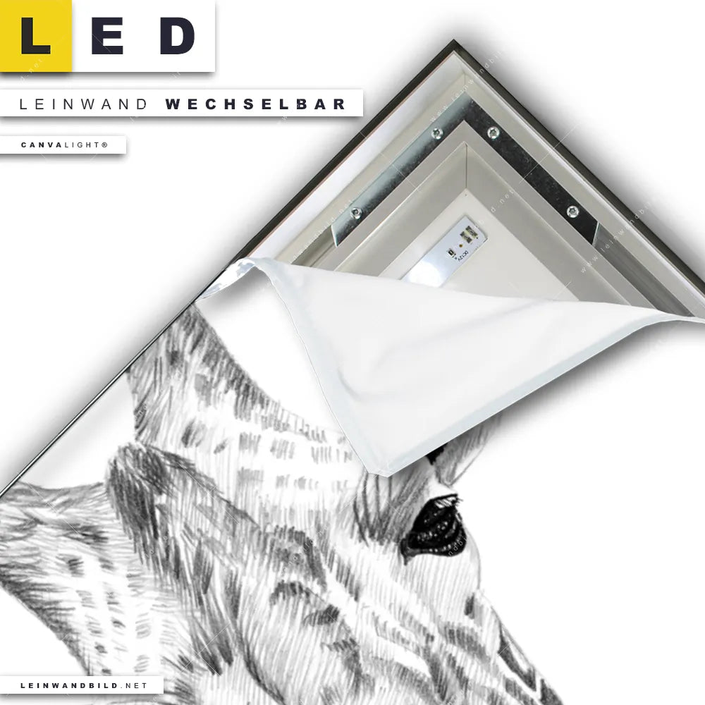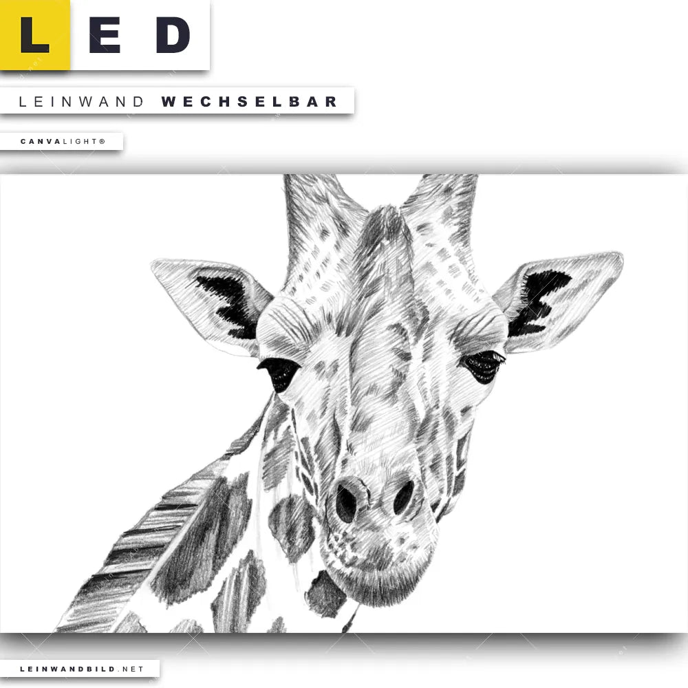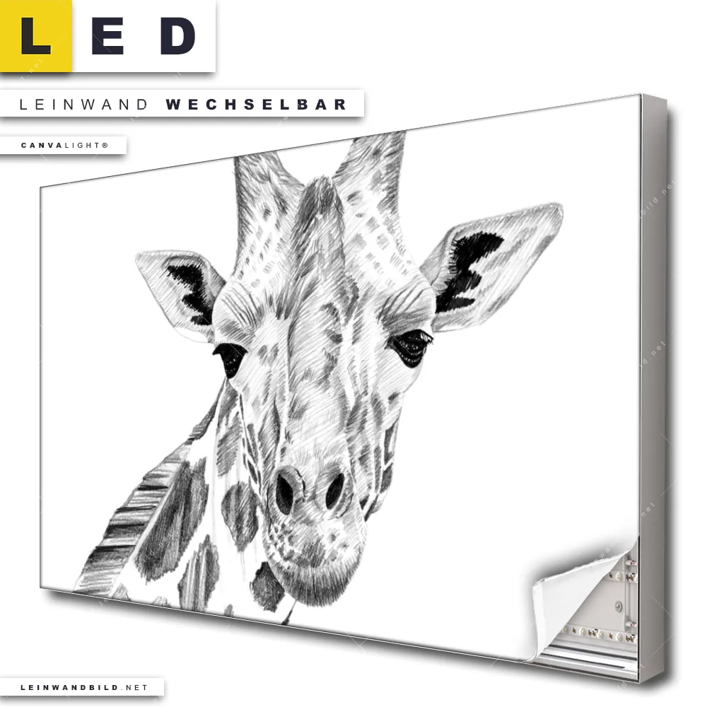 Du konfigurierst Dein individuelles LED Leinwandbild Canvalight® TEX | Bleistiftzeichnung Giraffe | Querformat und wir produzieren es NEU für Dich. Unsere Tierwelt LED Bilder mit wechselbarer Textil-Leinwand sind KEINE Lagerware. Du bist Dir unsicher, welches Motiv oder Format das richtige für dein individuelles Canvalight® Leuchtbild ist, dann helfen wir dir gerne weiter und beraten dich!