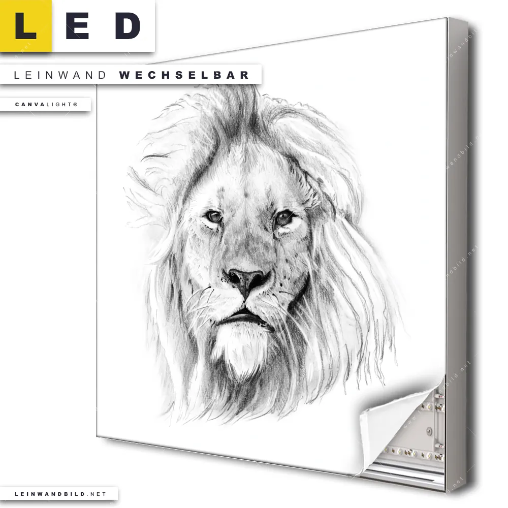 Du konfigurierst Dein individuelles LED Leinwandbild Canvalight® TEX | Bleistiftzeichnung Löwe | Quadrat und wir produzieren es NEU für Dich. Unsere Tierwelt LED Bilder mit wechselbarer Textil-Leinwand sind KEINE Lagerware. Du bist Dir unsicher, welches Motiv oder Format das richtige für dein individuelles Canvalight® Leuchtbild ist, dann helfen wir dir gerne weiter und beraten dich!
