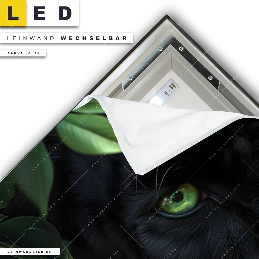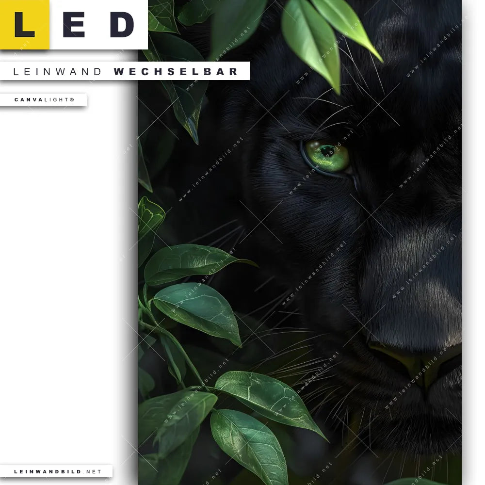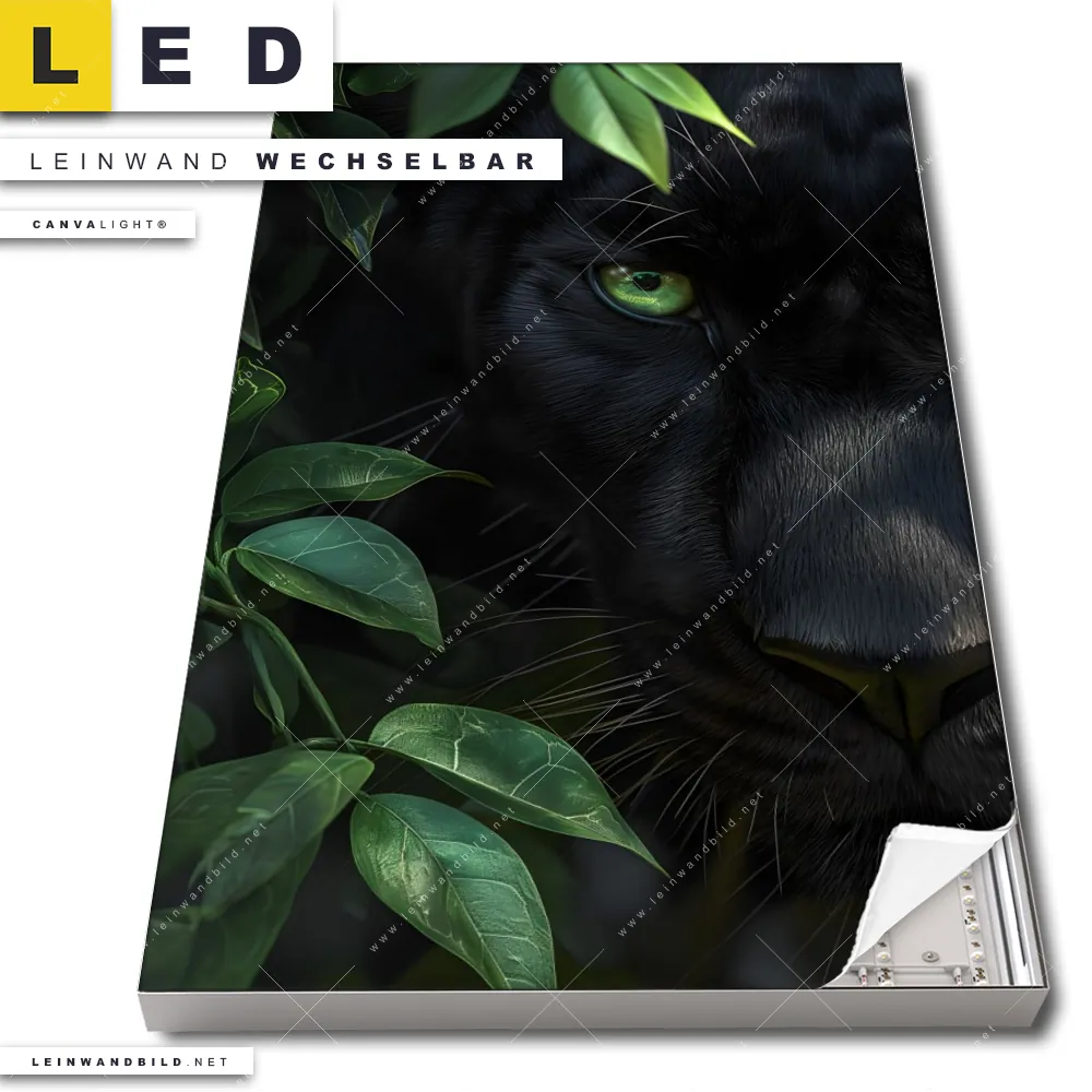 Du bist auf der Suche nach einem Tierwelt, Blumen - Botanik LED Leinwandbild im Hochformat? Begriffe wie Blätter, Natur, Nahaufnahme, Dschungel, Panther, Raubkatze, Regenwald, Wildkatze, Augen, Tierporträt haben Dich auf der Suche nach Deinem neuen XXL LED Wandbild mit wechselbarer Leinwand inspiriert? Farben wie Schwarz, Grün dürfen auf Deinem neuen Leinwand-LED-Bild nicht fehlen und Leuchtbilder im Modern Art, Floral Stil passen perfekt zu Deinem Einrichtungsstil?
