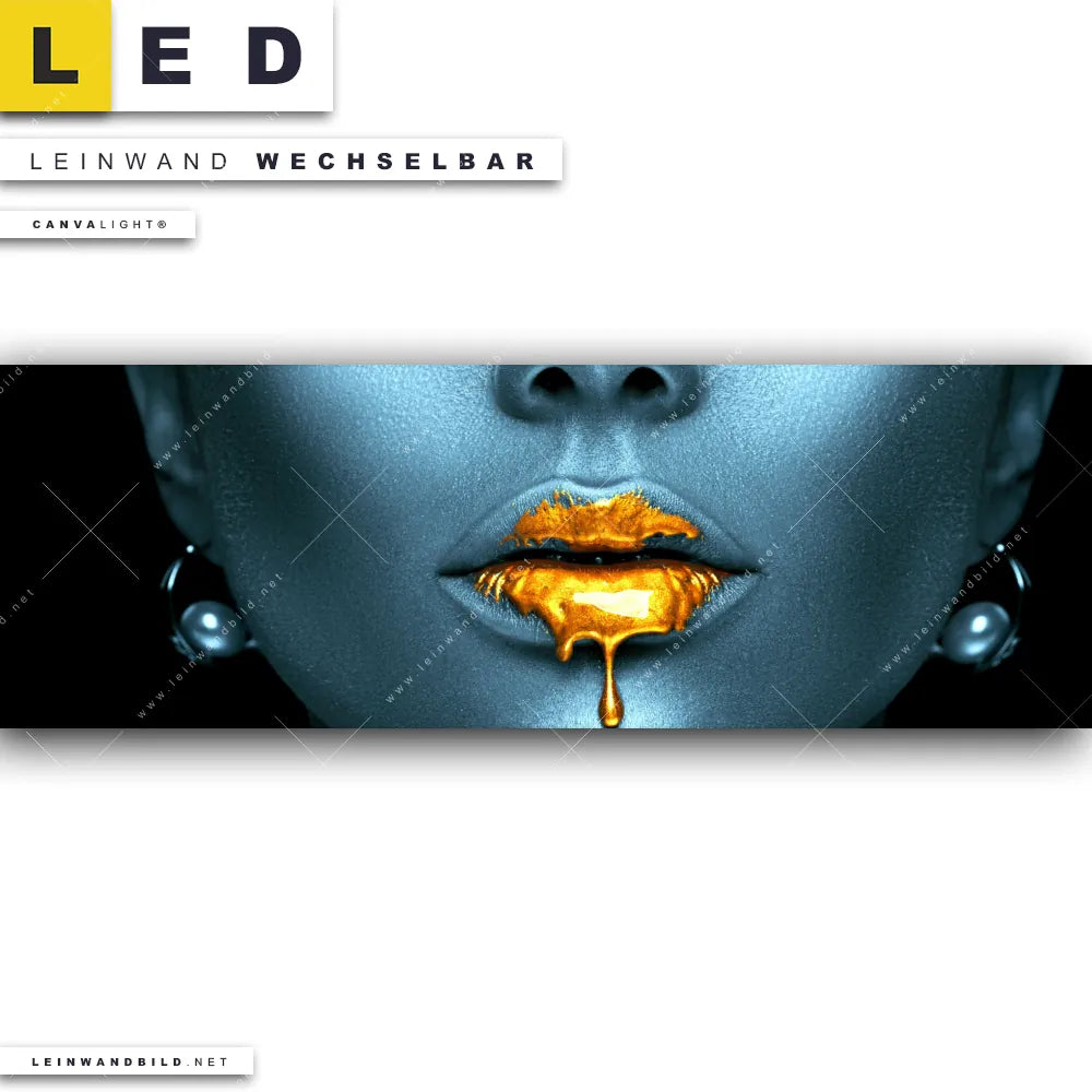 Du bist auf der Suche nach einem Porträts - Menschen LED Leinwandbild im Panorama-Format? Begriffe wie Frau, Lippen, Mund, Porträt, Farbe, Beauty haben Dich auf der Suche nach Deinem neuen XXL LED Wandbild mit wechselbarer Leinwand inspiriert? Farben wie Gold, Schwarz, Blau dürfen auf Deinem neuen extra breiten Leinwand-LED-Bild nicht fehlen und Leuchtbilder im Modern Art Stil passen perfekt zu Deinem Einrichtungsstil?