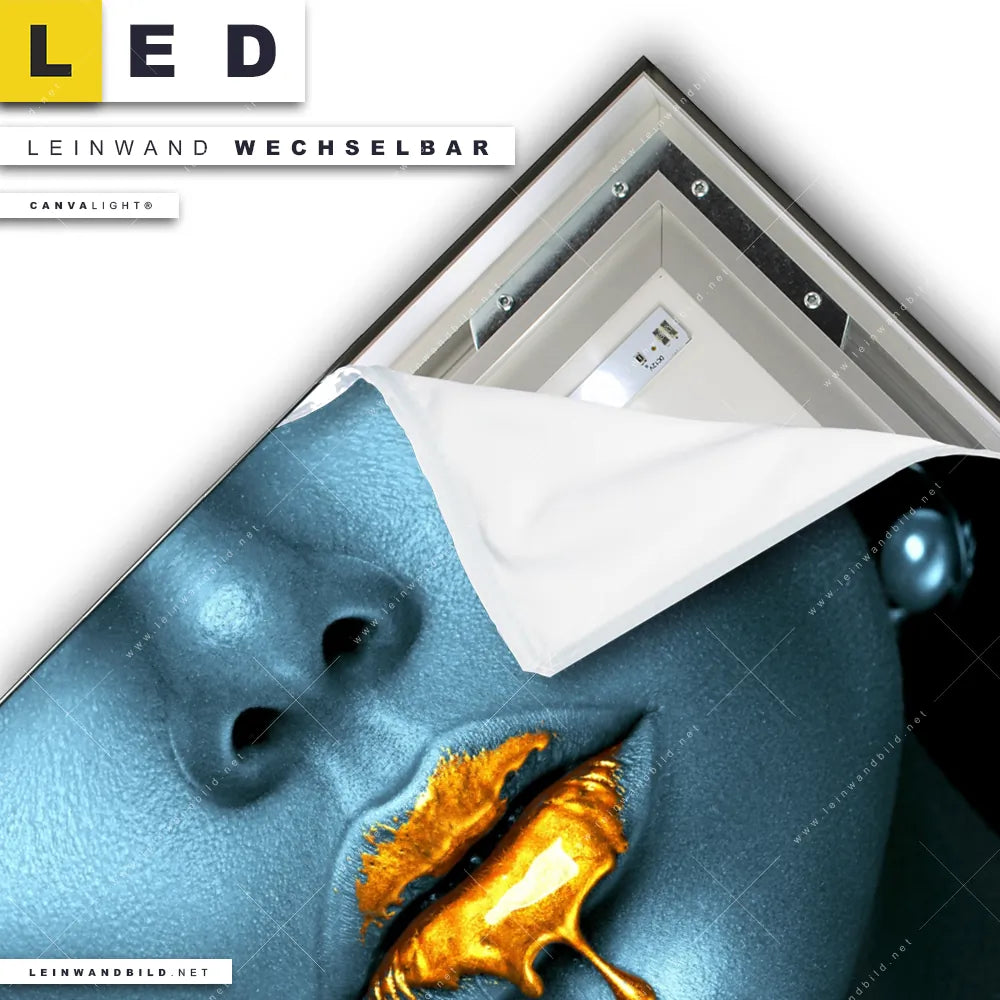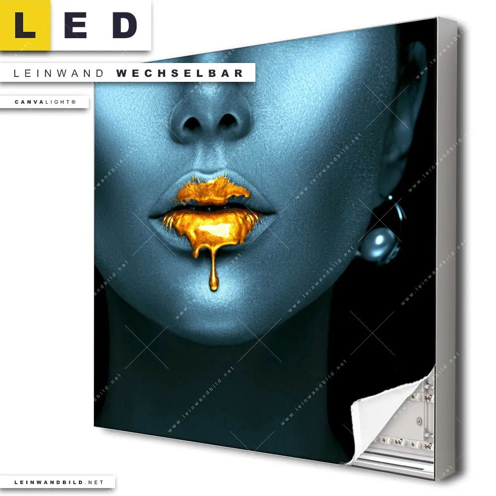 Du bist auf der Suche nach einem Porträts - Menschen LED Leinwandbild im Quadratischen Format? Begriffe wie Frau, Lippen, Mund, Porträt, Farbe, Beauty haben Dich auf der Suche nach Deinem neuen XXL LED Wandbild mit wechselbarer Leinwand inspiriert? Farben wie Gold, Schwarz, Blau dürfen auf Deinem neuen Leinwand-LED-Bild nicht fehlen und Leuchtbilder im Modern Art Stil passen perfekt zu Deinem Einrichtungsstil?