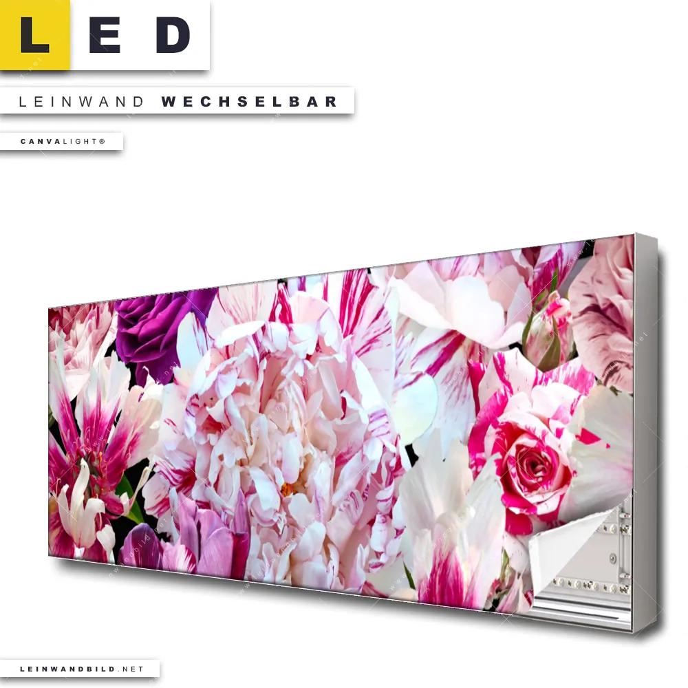 Du bist auf der Suche nach einem Blumen - Botanik LED Leinwandbild im Panorama-Format? Begriffe wie Pflanze, Natur, Blüte, Nahaufnahme, Draufsicht, vintage, Blumen, Rosen, Blüten, Pfingstrosen, Blumenstrauß haben Dich auf der Suche nach Deinem neuen XXL LED Wandbild mit wechselbarer Leinwand inspiriert? Farben wie Pink, Rosa, Lila, Weiss, Grün dürfen auf Deinem neuen extra breiten Leinwand-LED-Bild nicht fehlen und Leuchtbilder im Floral, Natürlich - Realistisch Stil passen perfekt zu Deinem Einrichtungsstil?
