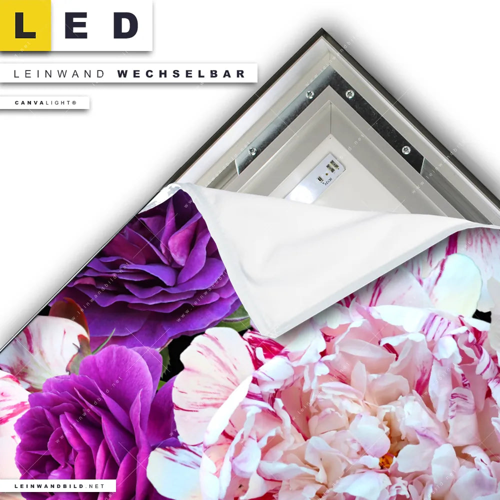 Du konfigurierst Dein individuelles LED Leinwandbild Canvalight® TEX | Blühende Pfingstrosen | Quadrat und wir produzieren es NEU für Dich. Unsere Blumen - Botanik LED Bilder mit wechselbarer Textil-Leinwand sind KEINE Lagerware. Du bist Dir unsicher, welches Motiv oder Format das richtige für dein individuelles Canvalight® Leuchtbild ist, dann helfen wir dir gerne weiter und beraten dich!