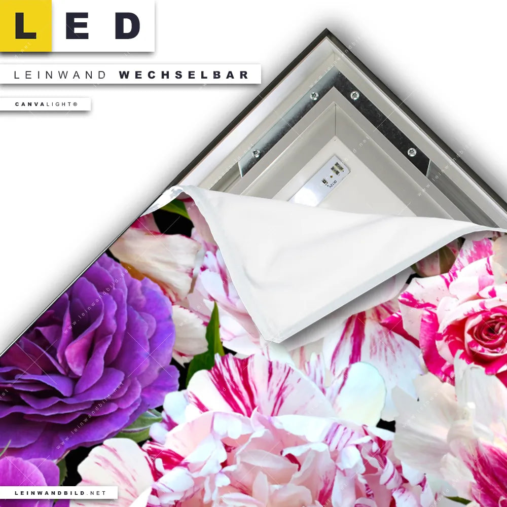 Du konfigurierst Dein individuelles LED Leinwandbild Canvalight® TEX | Blühende Pfingstrosen | Querformat und wir produzieren es NEU für Dich. Unsere Blumen - Botanik LED Bilder mit wechselbarer Textil-Leinwand sind KEINE Lagerware. Du bist Dir unsicher, welches Motiv oder Format das richtige für dein individuelles Canvalight® Leuchtbild ist, dann helfen wir dir gerne weiter und beraten dich!