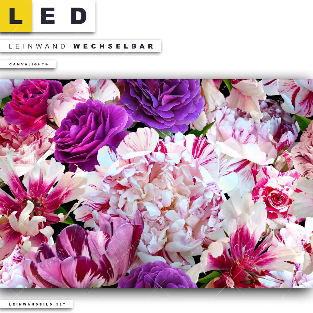 Du bist auf der Suche nach einem Blumen - Botanik LED Leinwandbild im Querformat? Begriffe wie Pflanze, Natur, Blüte, Nahaufnahme, Draufsicht, vintage, Blumen, Rosen, Blüten, Pfingstrosen, Blumenstrauß haben Dich auf der Suche nach Deinem neuen XXL LED Wandbild mit wechselbarer Leinwand inspiriert? Farben wie Pink, Rosa, Lila, Weiss, Grün dürfen auf Deinem neuen breiten Leinwand-LED-Bild nicht fehlen und Leuchtbilder im Floral, Natürlich - Realistisch Stil passen perfekt zu Deinem Einrichtungsstil?