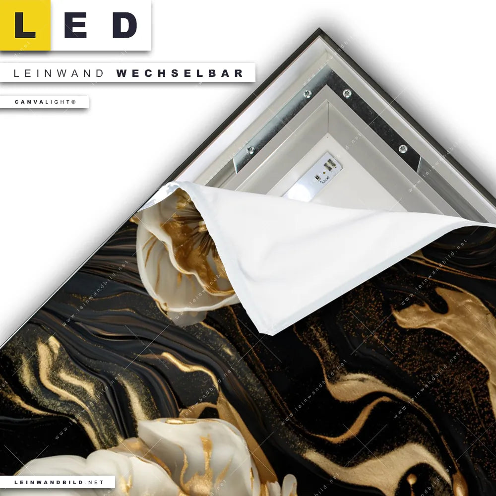 Du konfigurierst Dein individuelles LED Leinwandbild Canvalight® TEX | Blüten Gold Weiß Schwarz | Hochformat und wir produzieren es NEU für Dich. Unsere Blumen - Botanik LED Bilder mit wechselbarer Textil-Leinwand sind KEINE Lagerware. Du bist Dir unsicher, welches Motiv oder Format das richtige für dein individuelles Canvalight® Leuchtbild ist, dann helfen wir dir gerne weiter und beraten dich!