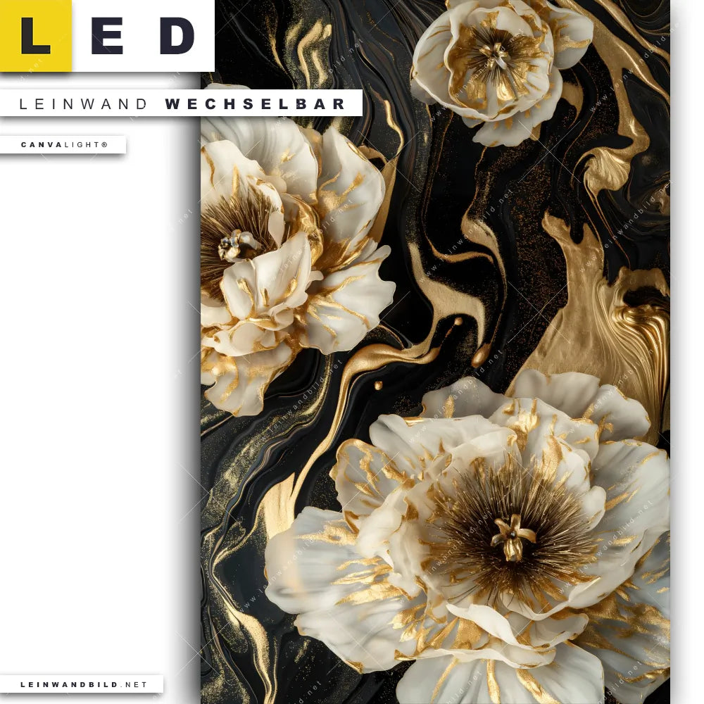 LED Leinwandbild Canvalight® TEX | Blüten Gold Weiß Schwarz | Hochformat