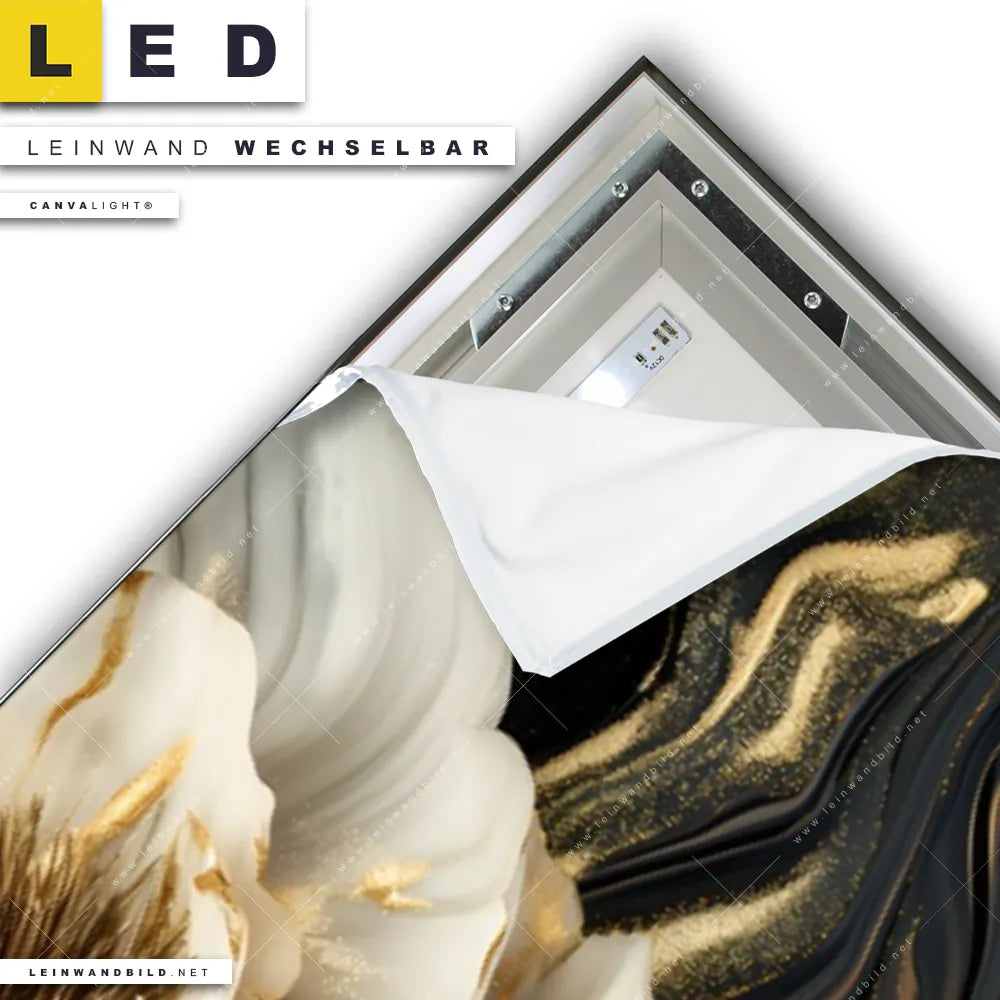Du konfigurierst Dein individuelles LED Leinwandbild Canvalight® TEX | Blüten Gold Weiß Schwarz | Panorama und wir produzieren es NEU für Dich. Unsere Blumen - Botanik LED Bilder mit wechselbarer Textil-Leinwand sind KEINE Lagerware. Du bist Dir unsicher, welches Motiv oder Format das richtige für dein individuelles Canvalight® Leuchtbild ist, dann helfen wir dir gerne weiter und beraten dich!