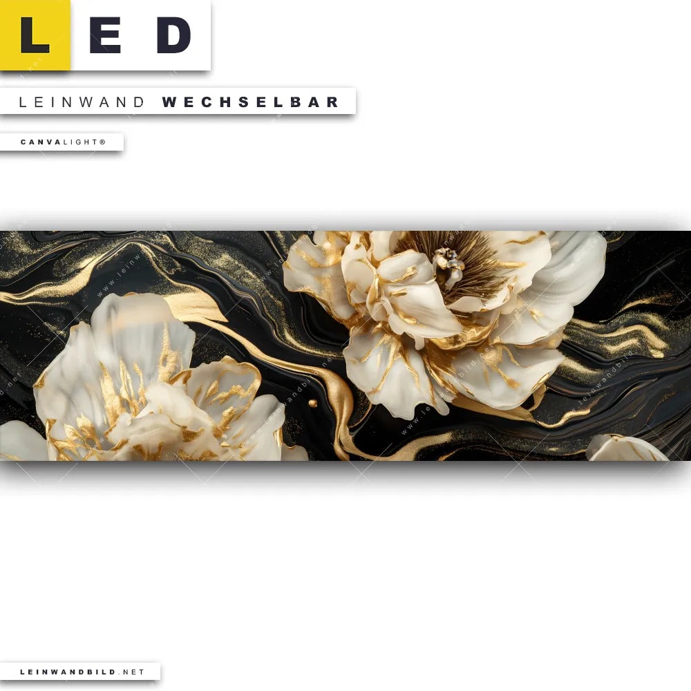 LED Leinwandbild Canvalight® TEX | Blüten Gold Weiß Schwarz | Panorama