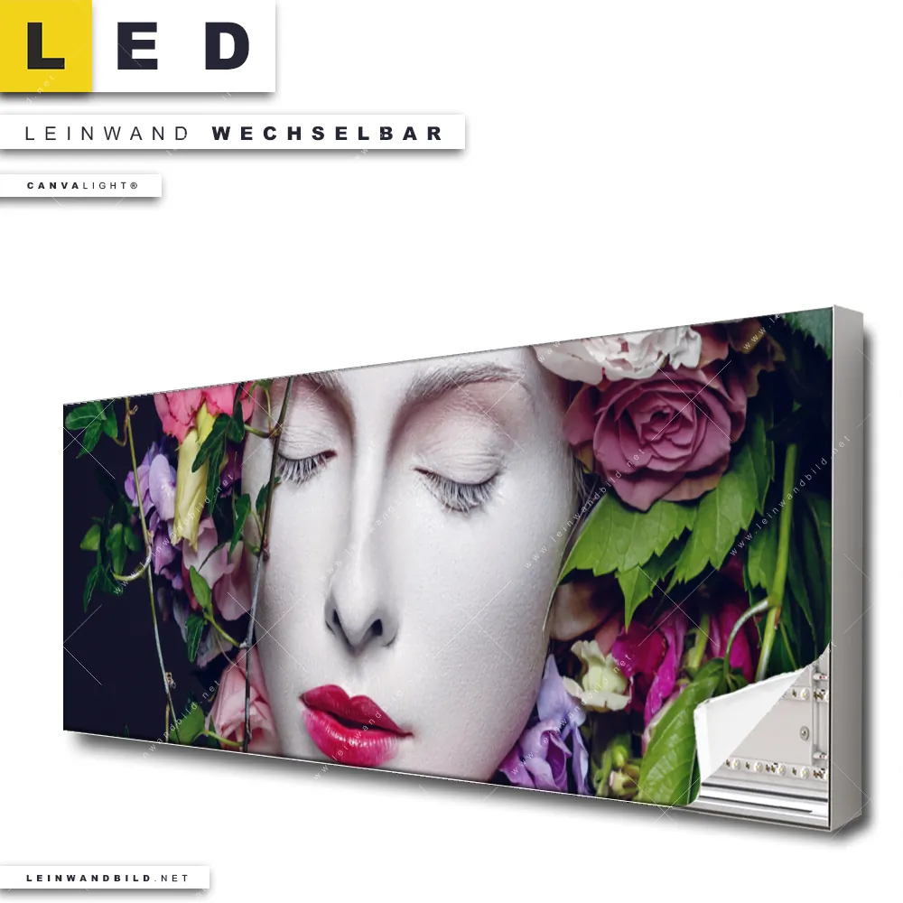 Du bist auf der Suche nach einem Porträts - Menschen, Blumen - Botanik LED Leinwandbild im Panorama-Format? Begriffe wie Menschen & Blumen, Frau, Porträt, modern, Beauty, Gesicht, Blumen, Blüten, Schönheit, Mode haben Dich auf der Suche nach Deinem neuen XXL LED Wandbild mit wechselbarer Leinwand inspiriert? Farben wie Schwarz, Weiss, Grün, Rosa, Rot, Lila dürfen auf Deinem neuen extra breiten Leinwand-LED-Bild nicht fehlen und Leuchtbilder im Modern Art, Floral Stil passen perfekt zu Deinem Einrichtungsstil?