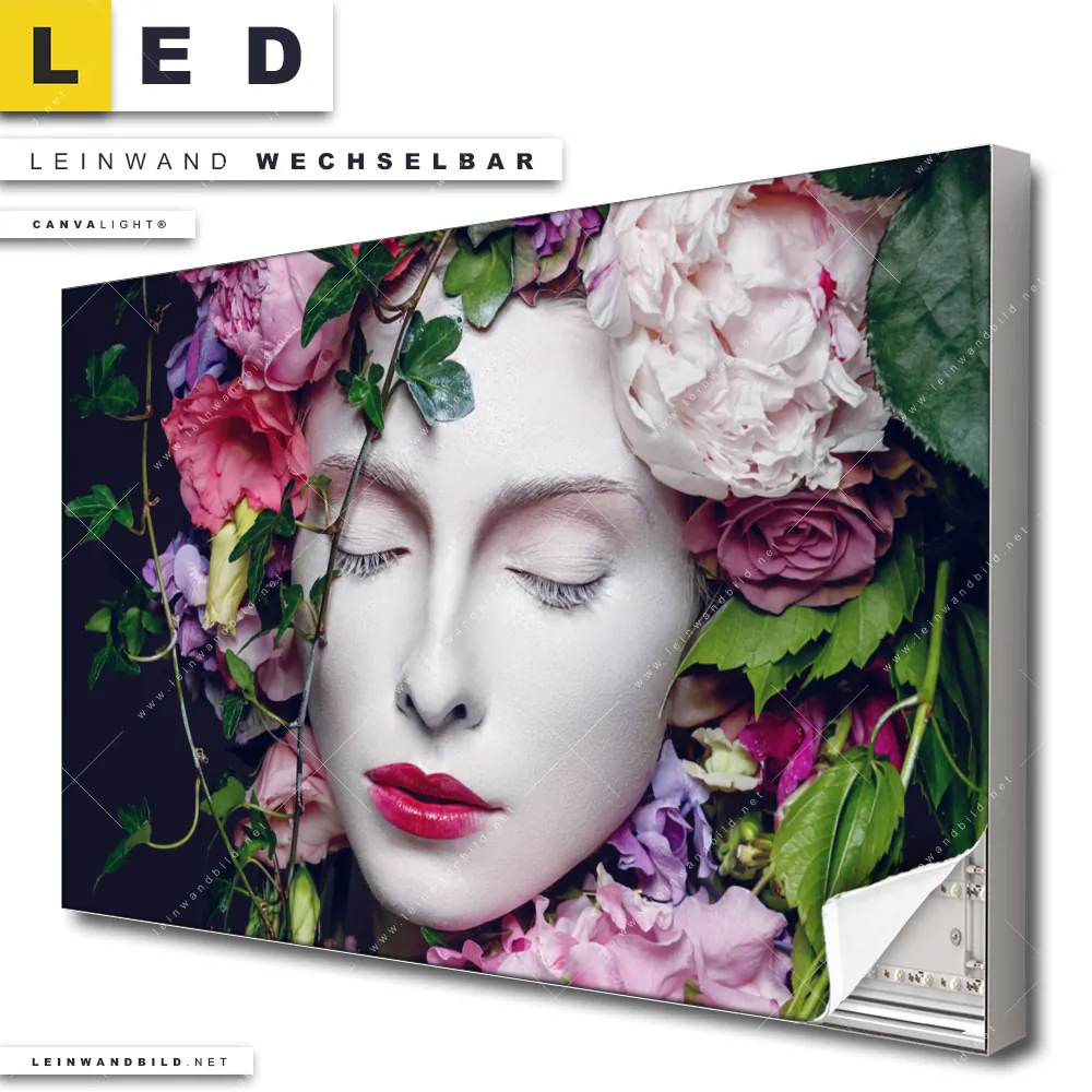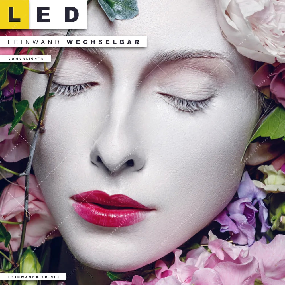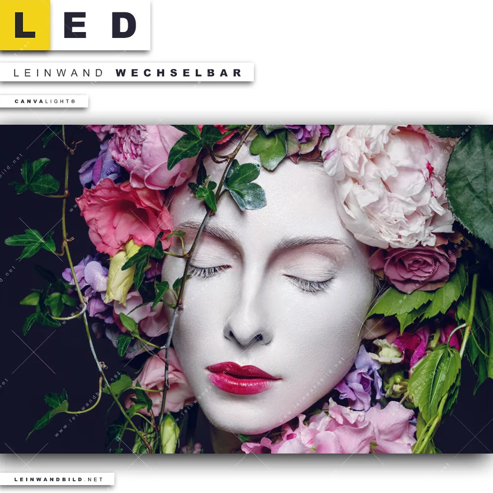 Du bist auf der Suche nach einem Porträts - Menschen, Blumen - Botanik LED Leinwandbild im Querformat? Begriffe wie Menschen & Blumen, Frau, Porträt, modern, Beauty, Gesicht, Blumen, Blüten, Schönheit, Mode haben Dich auf der Suche nach Deinem neuen XXL LED Wandbild mit wechselbarer Leinwand inspiriert? Farben wie Schwarz, Weiss, Grün, Rosa, Rot, Lila dürfen auf Deinem neuen breiten Leinwand-LED-Bild nicht fehlen und Leuchtbilder im Modern Art, Floral Stil passen perfekt zu Deinem Einrichtungsstil?