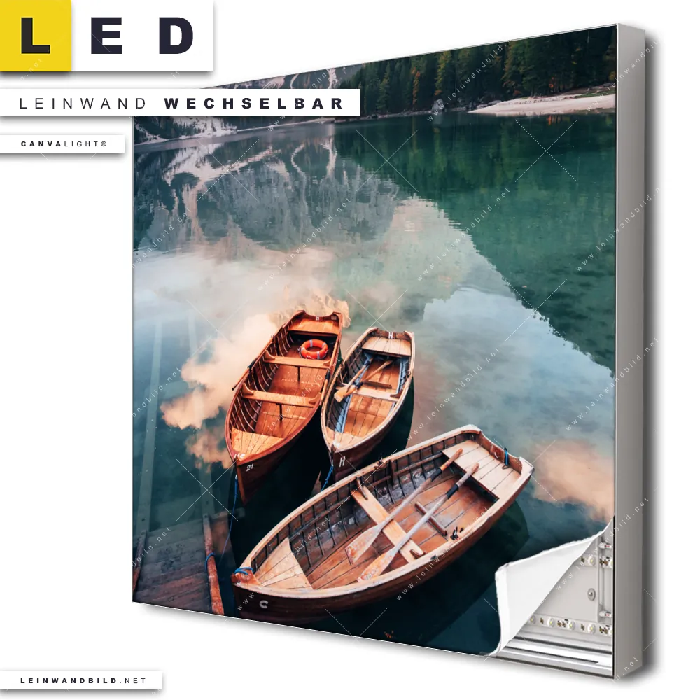 Du konfigurierst Dein individuelles LED Leinwandbild Canvalight® TEX | Boote im Bergsee | Quadrat und wir produzieren es NEU für Dich. Unsere Landschaften LED Bilder mit wechselbarer Textil-Leinwand sind KEINE Lagerware. Du bist Dir unsicher, welches Motiv oder Format das richtige für dein individuelles Canvalight® Leuchtbild ist, dann helfen wir dir gerne weiter und beraten dich!