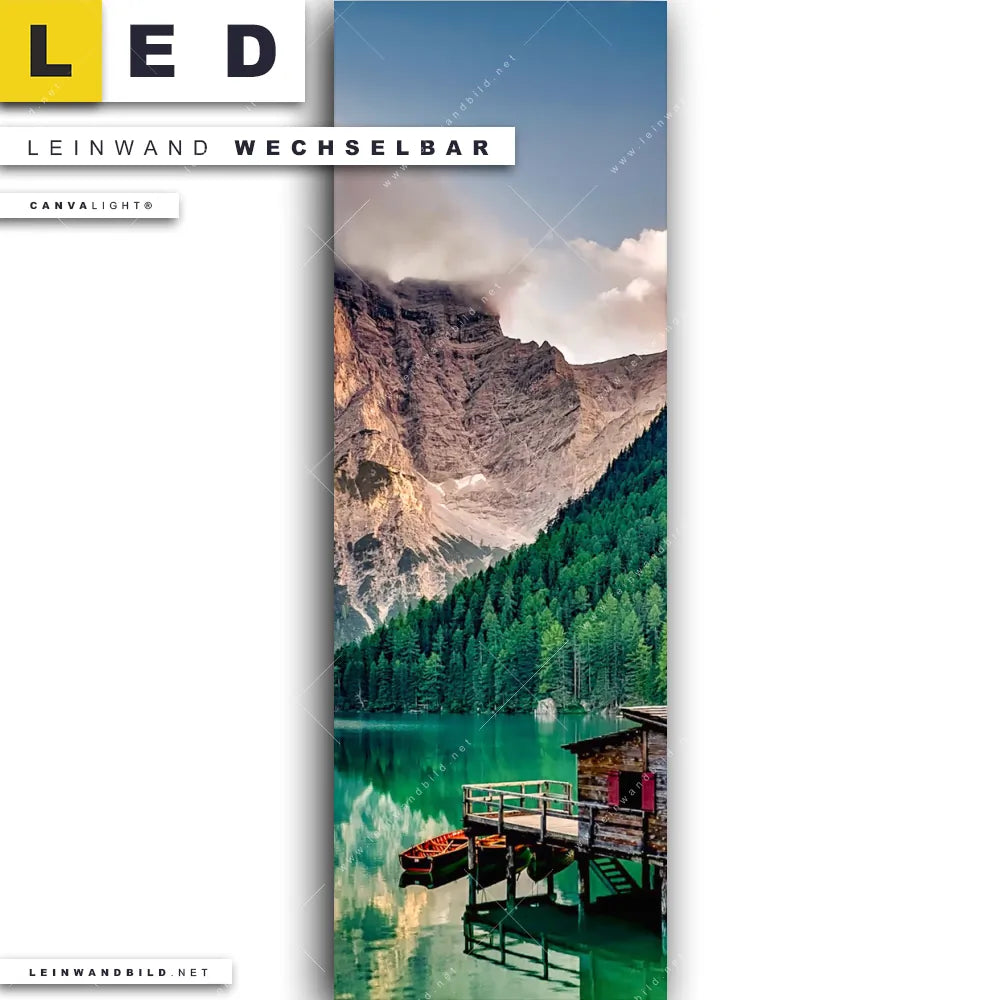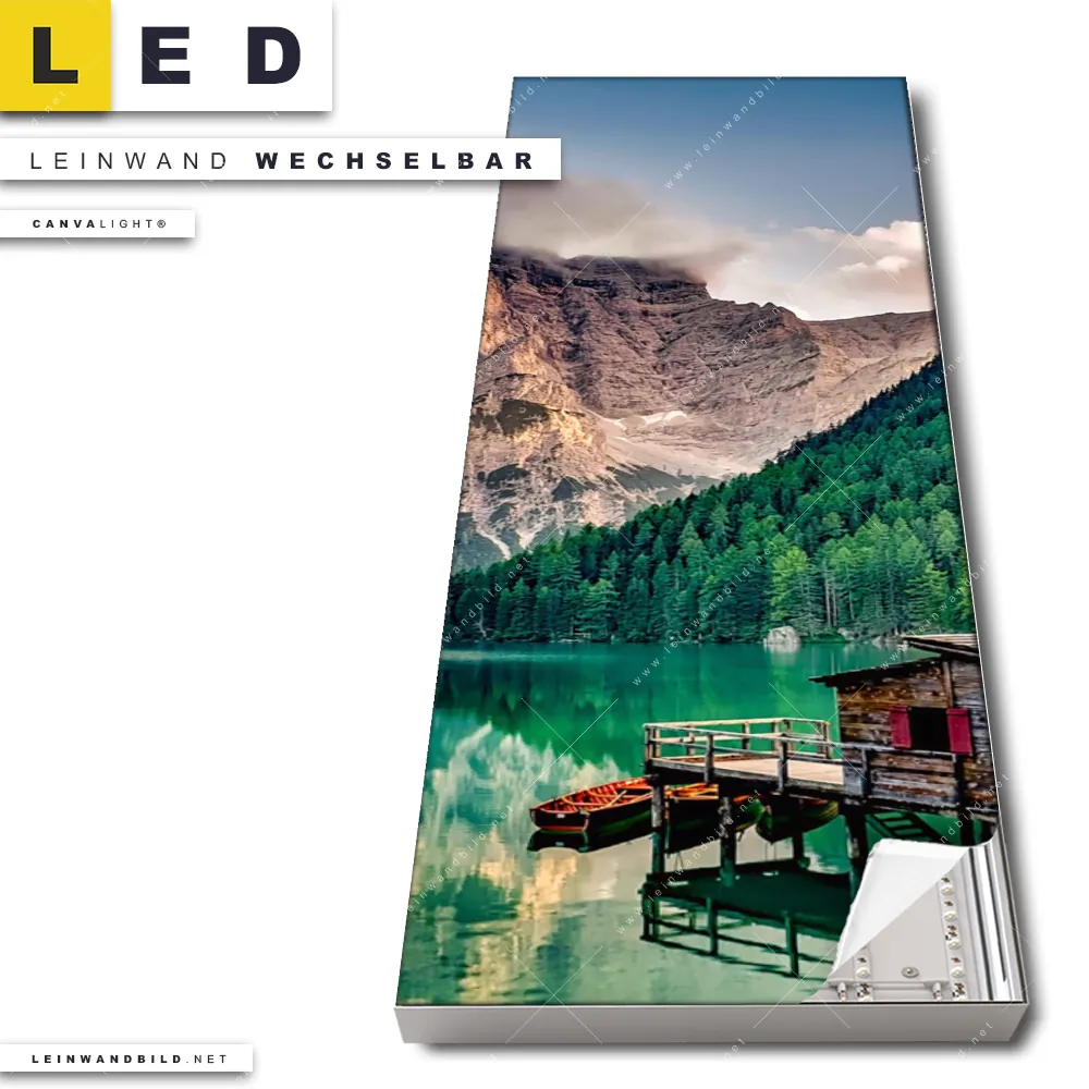 Dann sollte das LED Leinwandbild Canvalight® TEX | Bootshütte | Schmal den Weg zu Dir finden. Das stufenlos dimmbare Leinwandbild Berge und See mit Holzbooten im steckerfertigen Leuchtrahmen mit Fernbedienung und optionaler Farbtemperatursteuerung fügt sich als Eye-Catcher harmonisch in jedes Arzt - Praxis, Büro - Kanzlei, Wohnzimmer - Schlafzimmer, Flur - Eingangsbereich Raumkonzept ein.