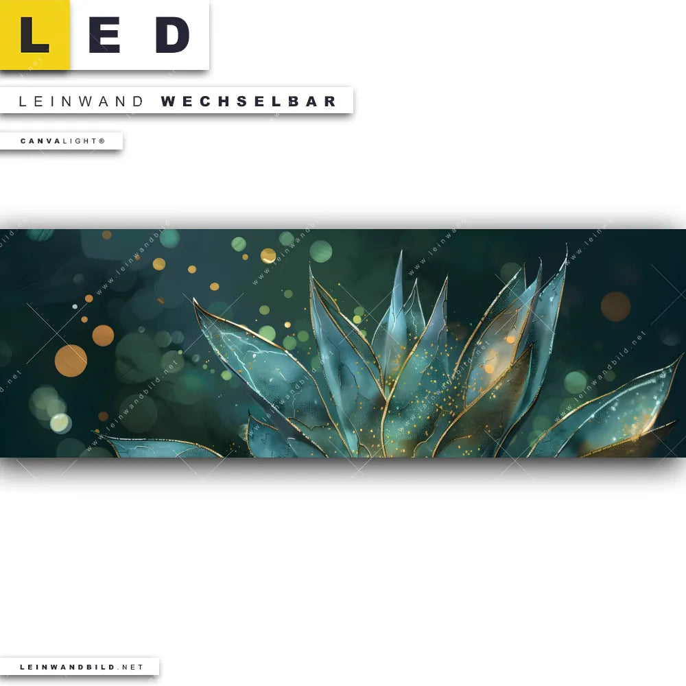 Du bist auf der Suche nach einem Blumen - Botanik LED Leinwandbild im Panorama-Format? Begriffe wie Blumen, Sukkulente, Kaktus, Pflanze, Natur, Blüten, Glitzer haben Dich auf der Suche nach Deinem neuen XXL LED Wandbild mit wechselbarer Leinwand inspiriert? Farben wie Grün, Gold, Türkis dürfen auf Deinem neuen extra breiten Leinwand-LED-Bild nicht fehlen und Leuchtbilder im Floral, Abstrakt, Modern Art Stil passen perfekt zu Deinem Einrichtungsstil?