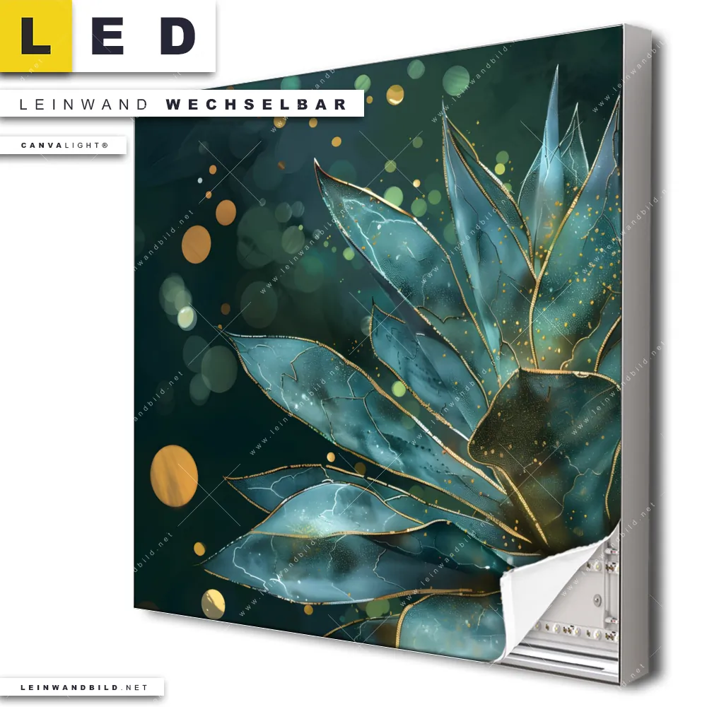 Du bist auf der Suche nach einem Blumen - Botanik LED Leinwandbild im Quadratischen Format? Begriffe wie Blumen, Sukkulente, Kaktus, Pflanze, Natur, Blüten, Glitzer haben Dich auf der Suche nach Deinem neuen XXL LED Wandbild mit wechselbarer Leinwand inspiriert? Farben wie Grün, Gold, Türkis dürfen auf Deinem neuen Leinwand-LED-Bild nicht fehlen und Leuchtbilder im Floral, Abstrakt, Modern Art Stil passen perfekt zu Deinem Einrichtungsstil?