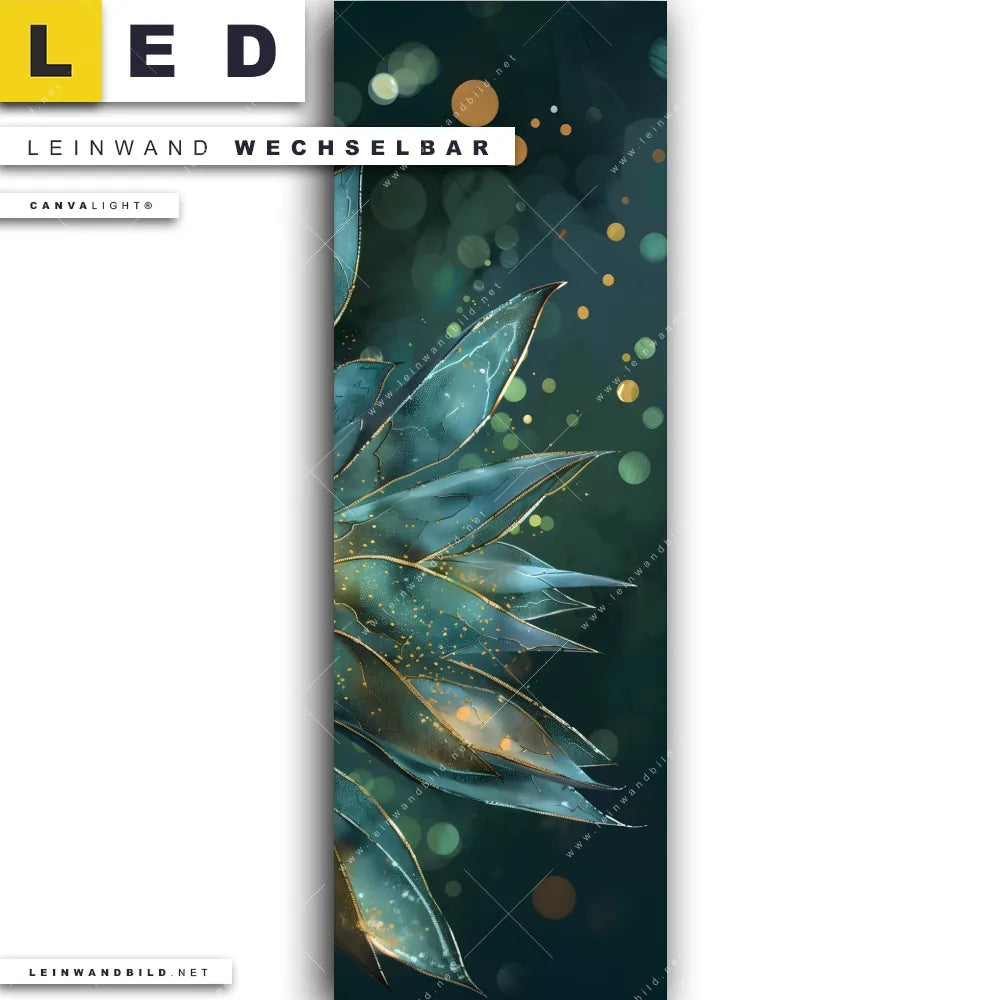 Du bist auf der Suche nach einem Blumen - Botanik LED Leinwandbild im Schmalen Format? Begriffe wie Blumen, Sukkulente, Kaktus, Pflanze, Natur, Blüten, Glitzer haben Dich auf der Suche nach Deinem neuen XXL LED Wandbild mit wechselbarer Leinwand inspiriert? Farben wie Grün, Gold, Türkis dürfen auf Deinem neuen Leinwand-LED-Bild im Panorama-Hochformat nicht fehlen und Leuchtbilder im Floral, Abstrakt, Modern Art Stil passen perfekt zu Deinem Einrichtungsstil?