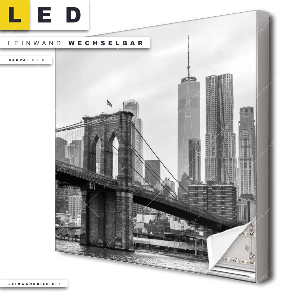 Du konfigurierst Dein individuelles LED Leinwandbild Canvalight® TEX | Brooklyn Bridge Schwarzweiß | Quadrat und wir produzieren es NEU für Dich. Unsere Architektur - Gebäude, Städte - Skylines LED Bilder mit wechselbarer Textil-Leinwand sind KEINE Lagerware. Du bist Dir unsicher, welches Motiv oder Format das richtige für dein individuelles Canvalight® Leuchtbild ist, dann helfen wir dir gerne weiter und beraten dich!