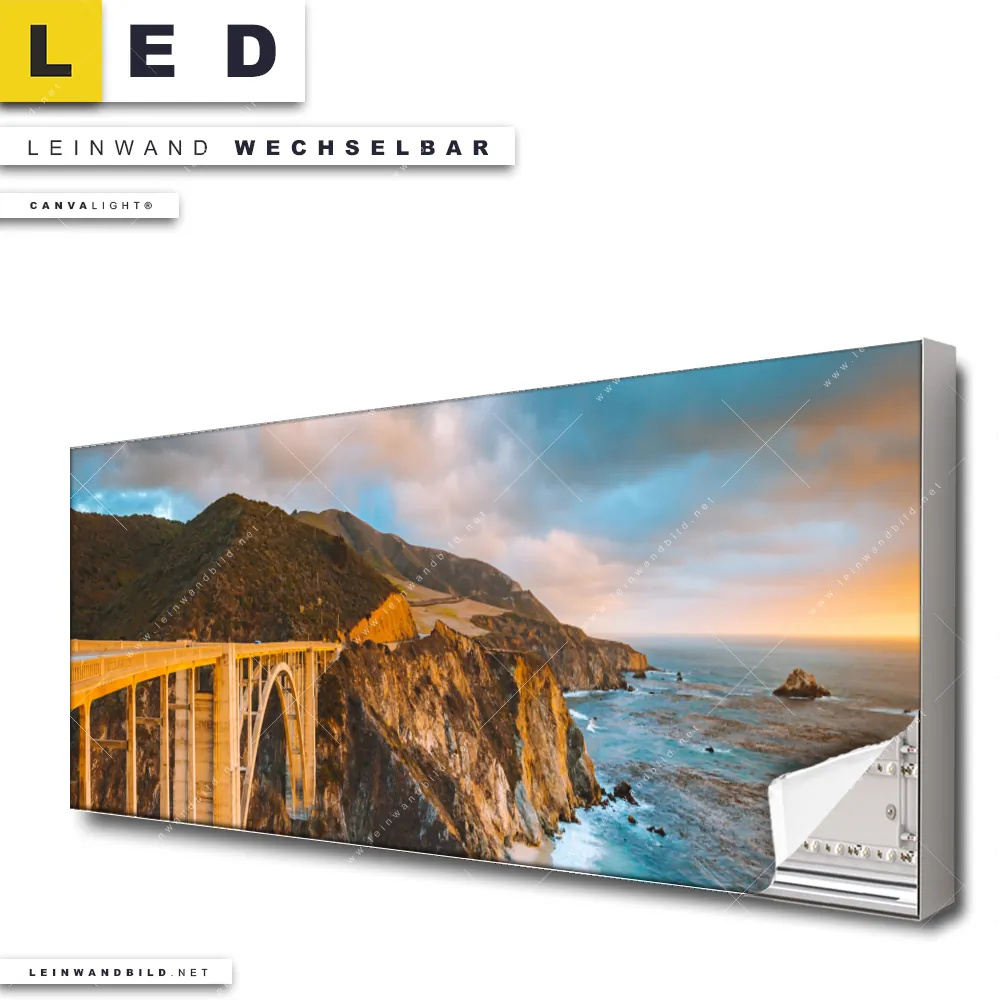 Du bist auf der Suche nach einem Landschaften LED Leinwandbild im Panorama-Format? Begriffe wie Urlaub, Reisen, Berge, Brücke, Küste, Wellen, Meer, Abendstimmung, Sonnenuntergang haben Dich auf der Suche nach Deinem neuen XXL LED Wandbild mit wechselbarer Leinwand inspiriert? Farben wie Blau, Orange, Hellblau dürfen auf Deinem neuen extra breiten Leinwand-LED-Bild nicht fehlen und Leuchtbilder im Natürlich - Realistisch Stil passen perfekt zu Deinem Einrichtungsstil?