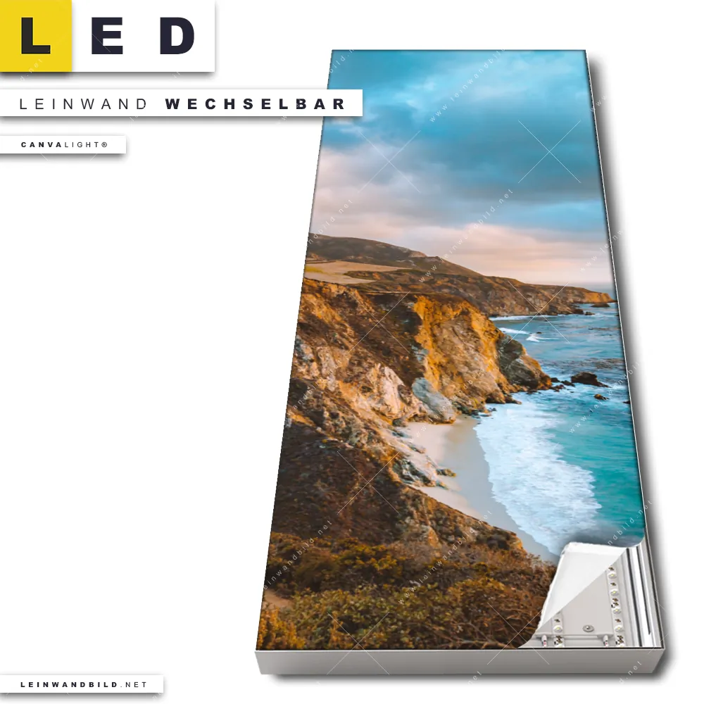 Du bist auf der Suche nach einem Landschaften LED Leinwandbild im Schmalen Format? Begriffe wie Urlaub, Reisen, Berge, Brücke, Küste, Wellen, Meer, Abendstimmung, Sonnenuntergang haben Dich auf der Suche nach Deinem neuen XXL LED Wandbild mit wechselbarer Leinwand inspiriert? Farben wie Blau, Orange, Hellblau dürfen auf Deinem neuen Leinwand-LED-Bild im Panorama-Hochformat nicht fehlen und Leuchtbilder im Natürlich - Realistisch Stil passen perfekt zu Deinem Einrichtungsstil?