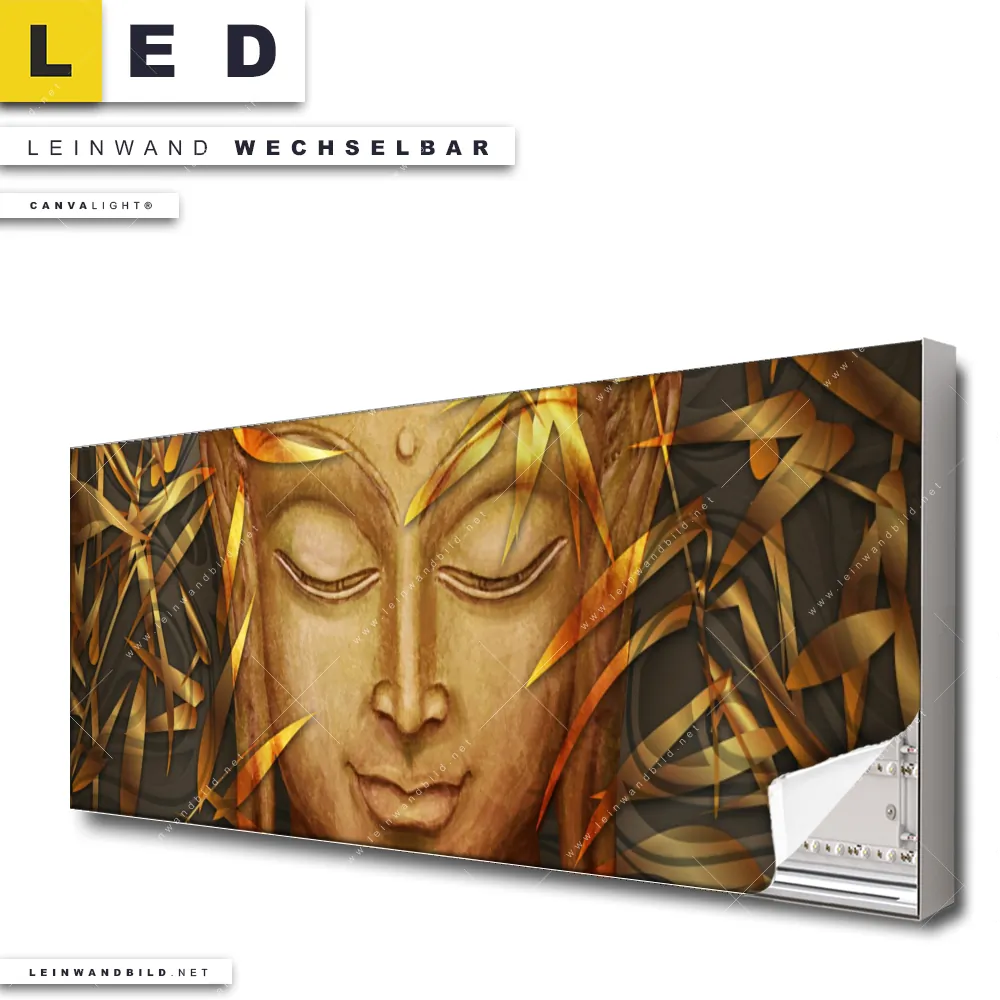 Du bist auf der Suche nach einem Buddha - Feng Shui LED Leinwandbild im Panorama-Format? Begriffe wie Buddha, Buddhismus, Religion, Feng Shui, Zen, Meditation, Gold haben Dich auf der Suche nach Deinem neuen XXL LED Wandbild mit wechselbarer Leinwand inspiriert? Farben wie Schwarz, Gold dürfen auf Deinem neuen extra breiten Leinwand-LED-Bild nicht fehlen und Leuchtbilder im Mixed Media, Modern Art Stil passen perfekt zu Deinem Einrichtungsstil?