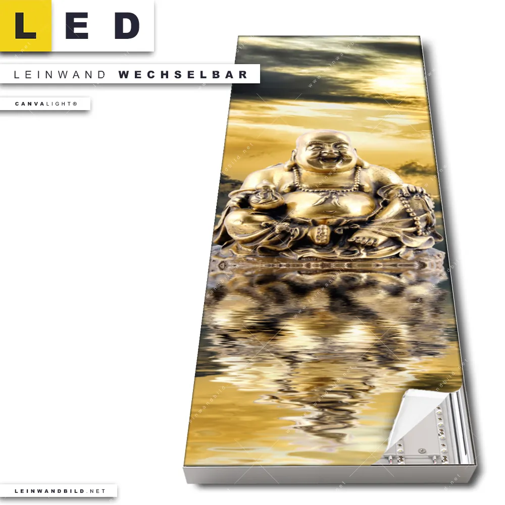 Du konfigurierst Dein individuelles LED Leinwandbild Canvalight® TEX | Buddha bei Sonnenaufgang | Schmal und wir produzieren es NEU für Dich. Unsere Buddha - Feng Shui LED Bilder mit wechselbarer Textil-Leinwand sind KEINE Lagerware. Du bist Dir unsicher, welches Motiv oder Format das richtige für dein individuelles Canvalight® Leuchtbild ist, dann helfen wir dir gerne weiter und beraten dich!