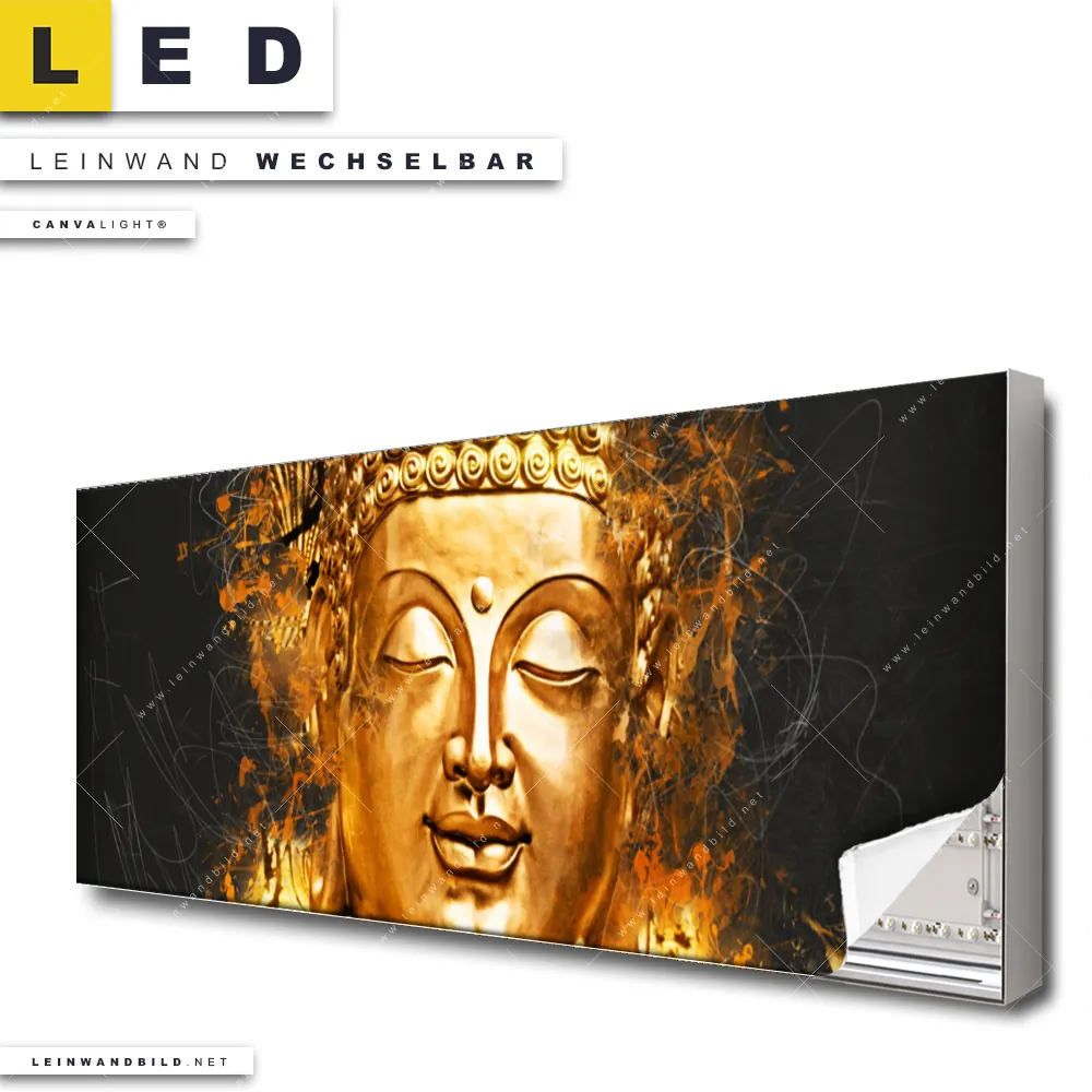 Du bist auf der Suche nach einem Buddha - Feng Shui LED Leinwandbild im Panorama-Format? Begriffe wie Buddha, Buddhismus, Religion, Feng Shui, Zen, Meditation, Farbspritzer haben Dich auf der Suche nach Deinem neuen XXL LED Wandbild mit wechselbarer Leinwand inspiriert? Farben wie Schwarz, Gold dürfen auf Deinem neuen extra breiten Leinwand-LED-Bild nicht fehlen und Leuchtbilder im Grunge, Mixed Media, Modern Art, Abstrakt Stil passen perfekt zu Deinem Einrichtungsstil?