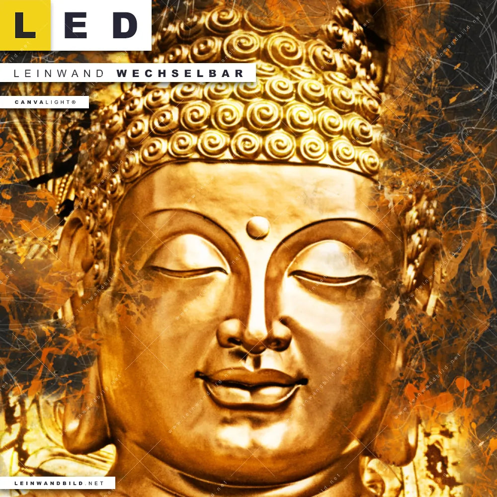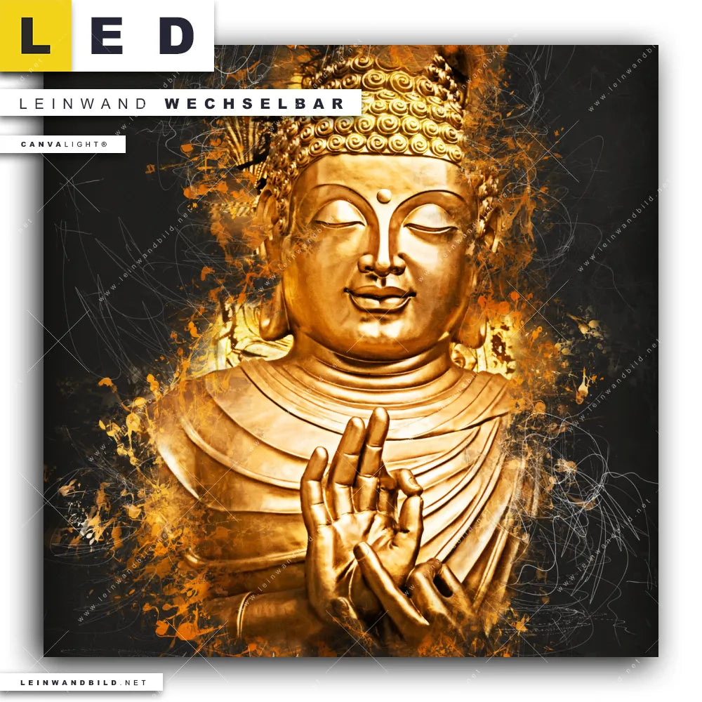 Du bist auf der Suche nach einem Buddha - Feng Shui LED Leinwandbild im Quadratischen Format? Begriffe wie Buddha, Buddhismus, Religion, Feng Shui, Zen, Meditation, Farbspritzer haben Dich auf der Suche nach Deinem neuen XXL LED Wandbild mit wechselbarer Leinwand inspiriert? Farben wie Schwarz, Gold dürfen auf Deinem neuen Leinwand-LED-Bild nicht fehlen und Leuchtbilder im Grunge, Mixed Media, Modern Art, Abstrakt Stil passen perfekt zu Deinem Einrichtungsstil?