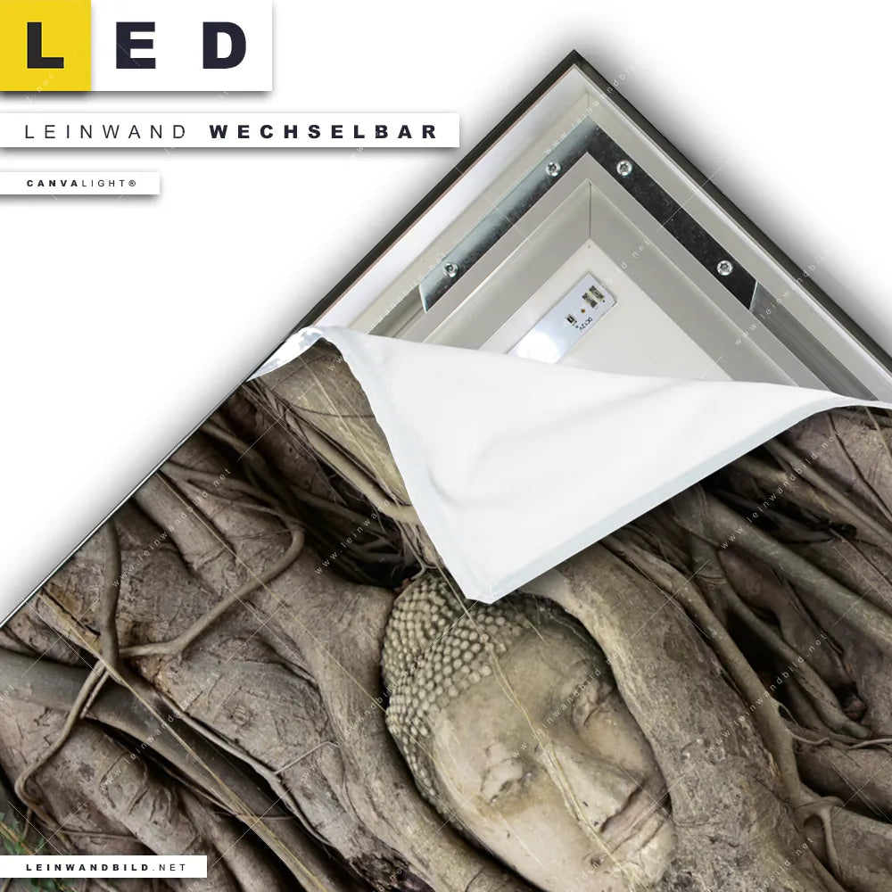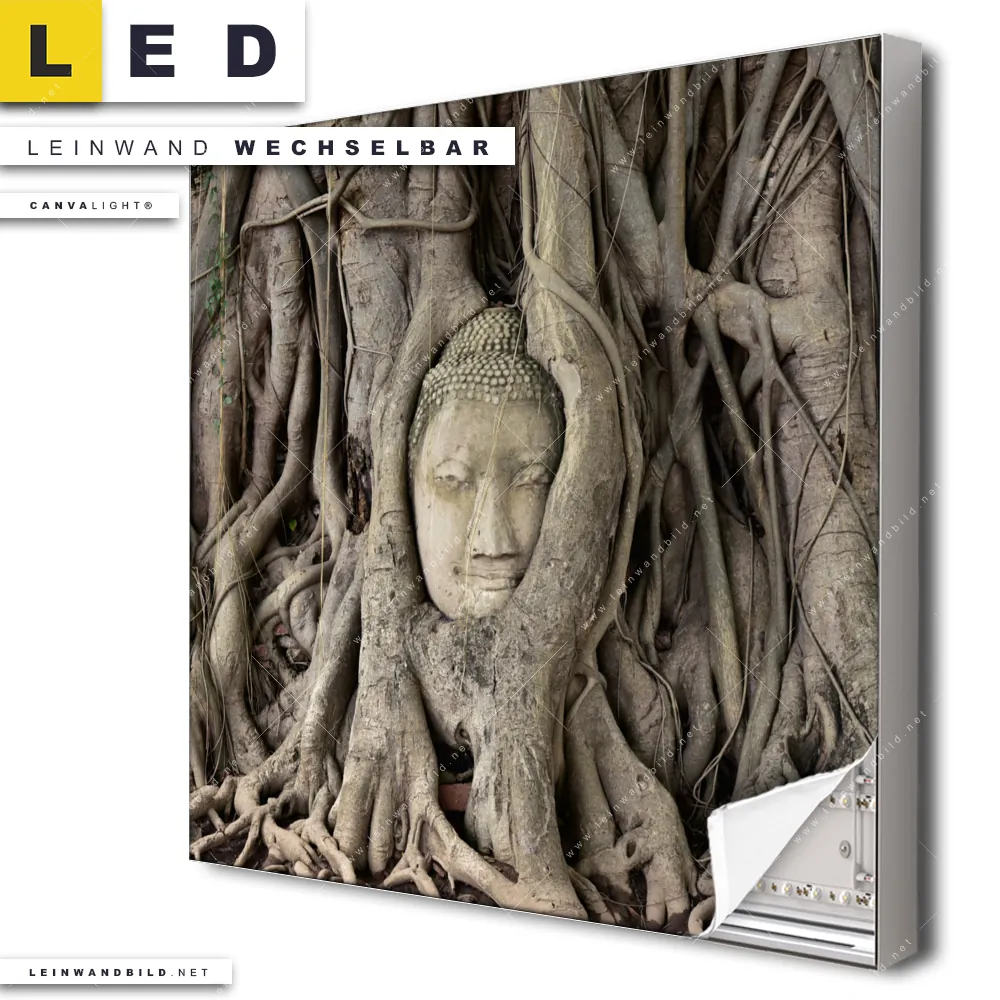 Du konfigurierst Dein individuelles LED Leinwandbild Canvalight® TEX | Buddha in Baumwurzeln | Quadrat und wir produzieren es NEU für Dich. Unsere Buddha - Feng Shui LED Bilder mit wechselbarer Textil-Leinwand sind KEINE Lagerware. Du bist Dir unsicher, welches Motiv oder Format das richtige für dein individuelles Canvalight® Leuchtbild ist, dann helfen wir dir gerne weiter und beraten dich!
