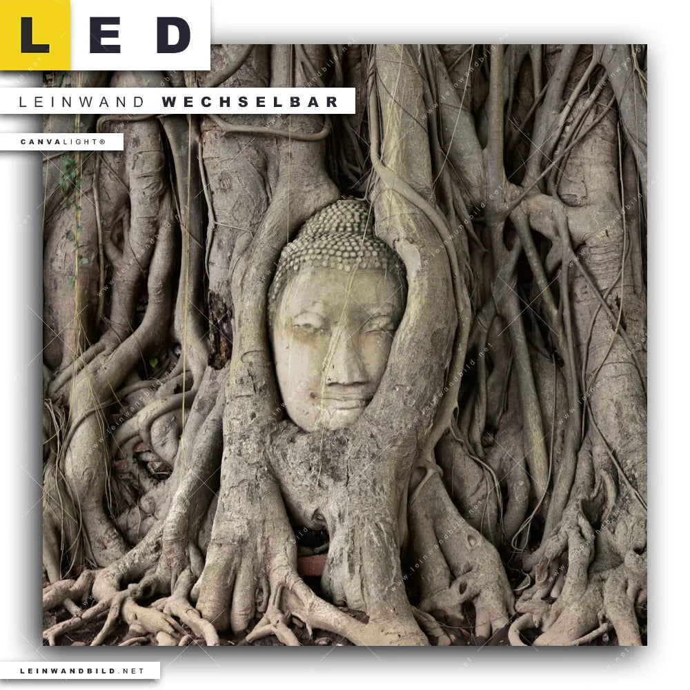 Du bist auf der Suche nach einem Buddha - Feng Shui LED Leinwandbild im Quadratischen Format? Begriffe wie Buddha, Buddhismus, Religion, Feng Shui, Zen, Meditation, spirituell, heilig, Esoterik, Gott, Gesicht, Statue, Wurzeln, Baum haben Dich auf der Suche nach Deinem neuen XXL LED Wandbild mit wechselbarer Leinwand inspiriert? Farben wie Beige, Braun dürfen auf Deinem neuen Leinwand-LED-Bild nicht fehlen und Leuchtbilder im Modern Art, Natürlich - Realistisch Stil passen perfekt zu Deinem Einrichtungsstil?