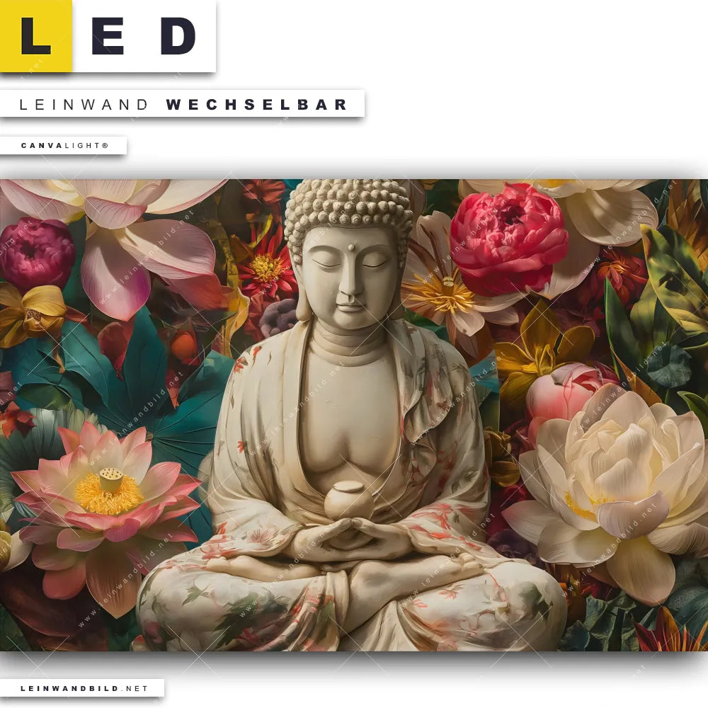 LED Leinwandbild Canvalight® TEX | Buddha in farbenfrohen Blumen | Querformat