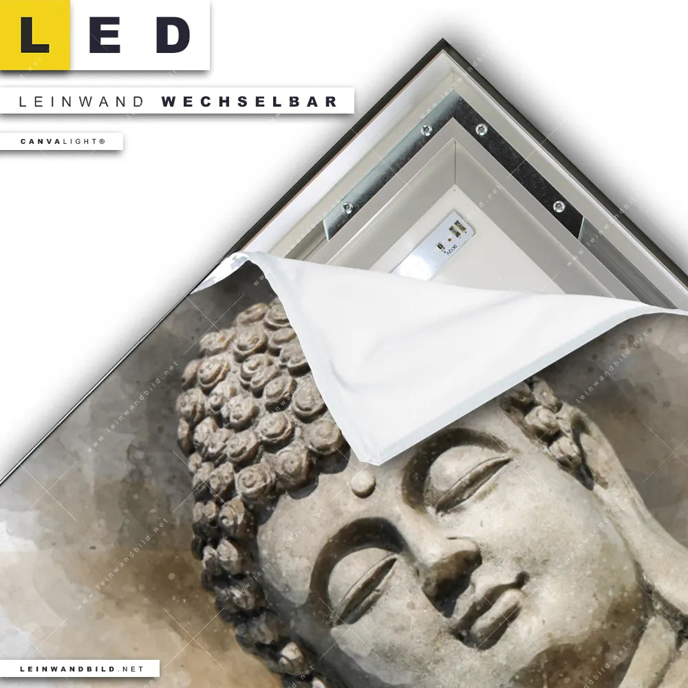 Du bist auf der Suche nach einem Buddha - Feng Shui LED Leinwandbild im Hochformat? Begriffe wie Buddha, Buddhismus, Religion, Feng Shui, Zen, Meditation, spirituell, heilig, Esoterik, Gott, Gesicht, Statue haben Dich auf der Suche nach Deinem neuen XXL LED Wandbild mit wechselbarer Leinwand inspiriert? Farben wie Beige, Weiss dürfen auf Deinem neuen Leinwand-LED-Bild nicht fehlen und Leuchtbilder im Mixed Media, Modern Art Stil passen perfekt zu Deinem Einrichtungsstil?