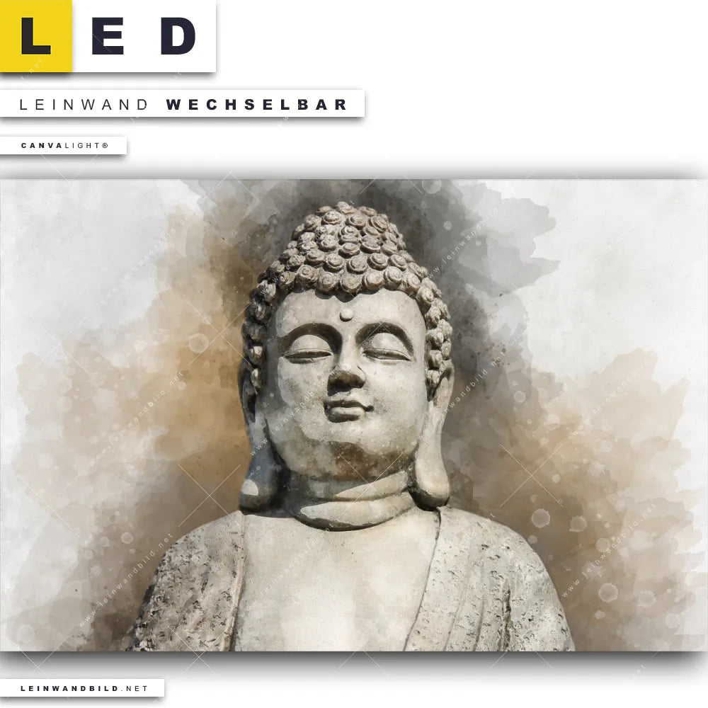 Du bist auf der Suche nach einem Buddha - Feng Shui LED Leinwandbild im Querformat? Begriffe wie Buddha, Buddhismus, Religion, Feng Shui, Zen, Meditation, spirituell, heilig, Esoterik, Gott, Gesicht, Statue haben Dich auf der Suche nach Deinem neuen XXL LED Wandbild mit wechselbarer Leinwand inspiriert? Farben wie Beige, Weiss dürfen auf Deinem neuen breiten Leinwand-LED-Bild nicht fehlen und Leuchtbilder im Mixed Media, Modern Art Stil passen perfekt zu Deinem Einrichtungsstil?