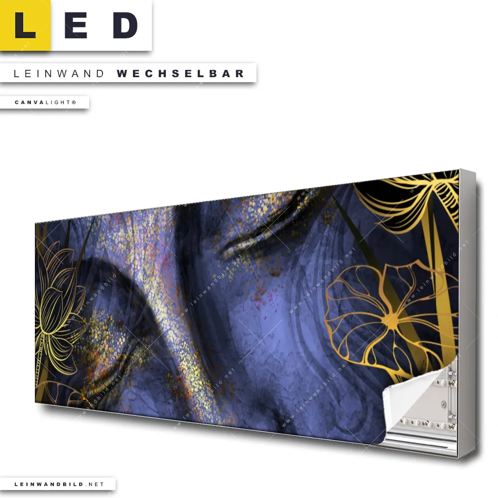 LED Leinwandbild Canvalight® TEX | Buddha in Gold & Blau | Panorama