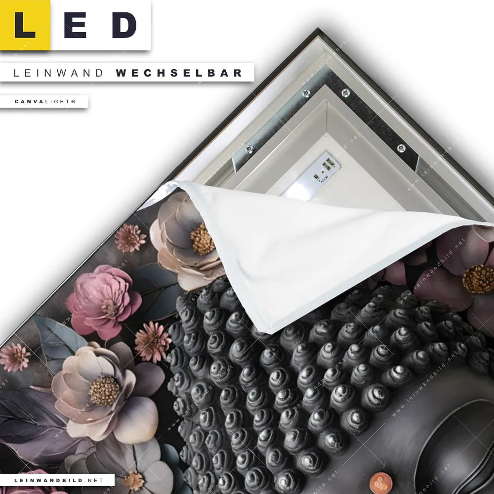 LED Leinwandbild Canvalight® TEX | Buddha-Kunst mit Pastellblüten | Hochformat