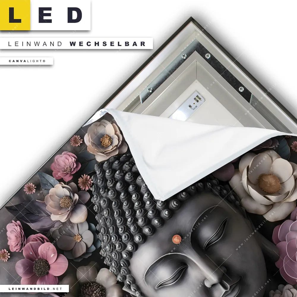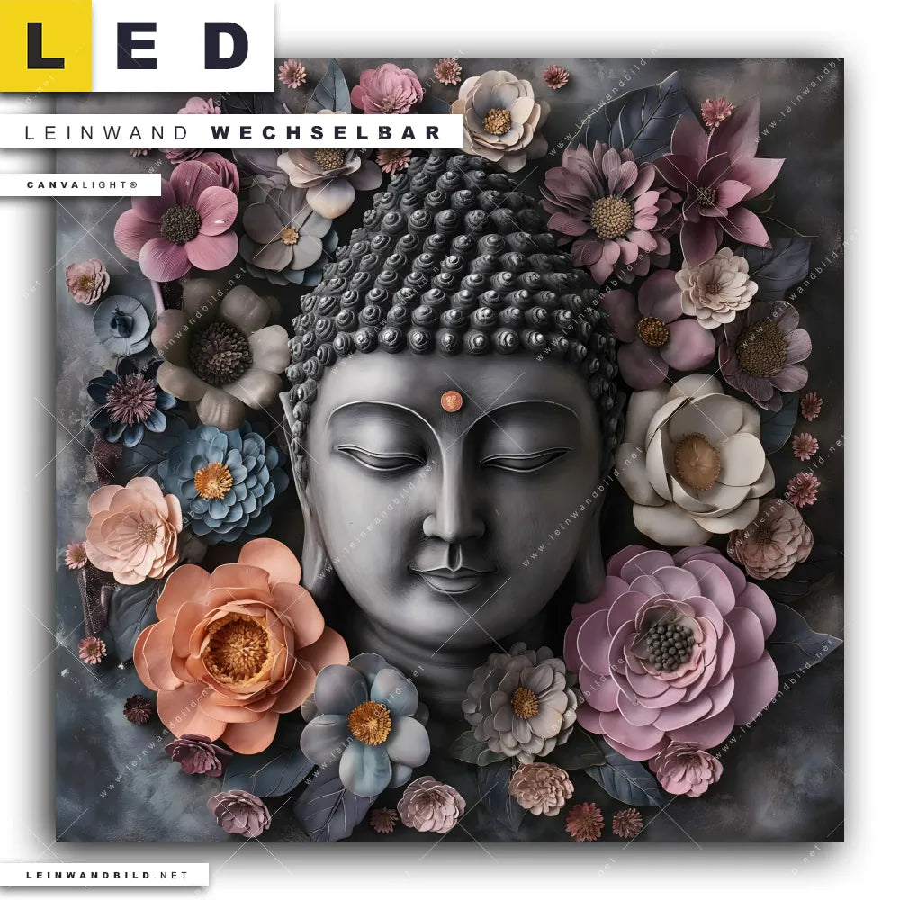 Du bist auf der Suche nach einem Buddha - Feng Shui, Blumen - Botanik LED Leinwandbild im Quadratischen Format? Begriffe wie Buddha, Buddhismus, Religion, Meditation, Blumen, Porträt, Spirituell, Statue haben Dich auf der Suche nach Deinem neuen XXL LED Wandbild mit wechselbarer Leinwand inspiriert? Farben wie Pink, Rosa, Grau dürfen auf Deinem neuen Leinwand-LED-Bild nicht fehlen und Leuchtbilder im Modern Art, Mixed Media, Floral Stil passen perfekt zu Deinem Einrichtungsstil?