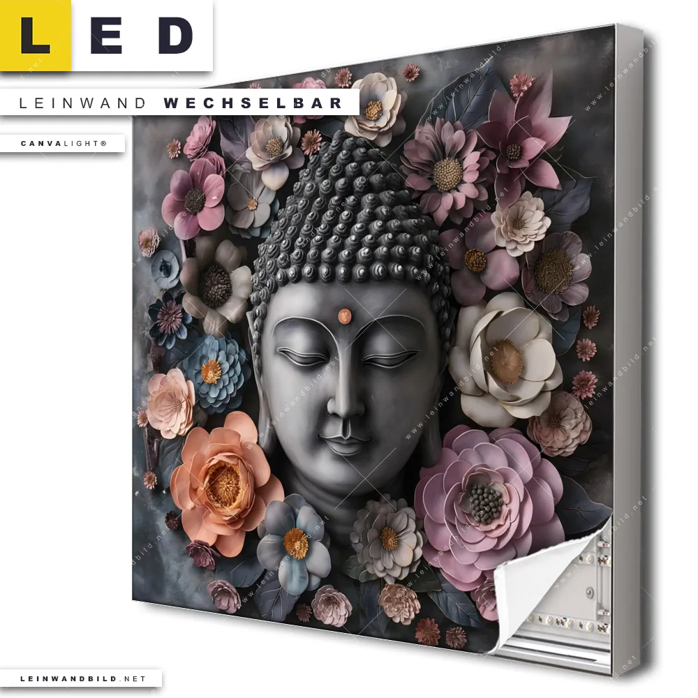 LED Leinwandbild Canvalight® TEX | Buddha-Kunst mit Pastellblüten | Quadrat