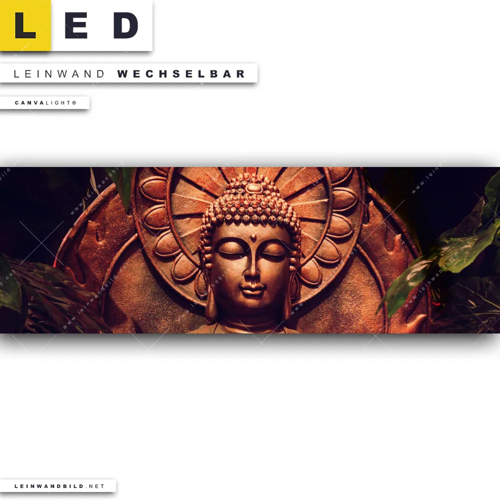 Du bist auf der Suche nach einem Buddha - Feng Shui LED Leinwandbild im Panorama-Format? Begriffe wie Buddha, Buddhismus, Religion, Feng Shui, Zen, Meditation, spirituell, heilig, Esoterik, Gott, Gesicht, Blüte, Lotus, Lotusblüte haben Dich auf der Suche nach Deinem neuen XXL LED Wandbild mit wechselbarer Leinwand inspiriert? Farben wie Braun, Blau dürfen auf Deinem neuen extra breiten Leinwand-LED-Bild nicht fehlen und Leuchtbilder im Modern Art, Natürlich - Realistisch Stil passen perfekt zu Deinem Einrichtungsstil?
