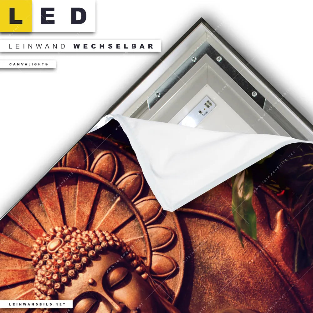 Du konfigurierst Dein individuelles LED Leinwandbild Canvalight® TEX | Buddha & Lotusblüte | Querformat und wir produzieren es NEU für Dich. Unsere Buddha - Feng Shui LED Bilder mit wechselbarer Textil-Leinwand sind KEINE Lagerware. Du bist Dir unsicher, welches Motiv oder Format das richtige für dein individuelles Canvalight® Leuchtbild ist, dann helfen wir dir gerne weiter und beraten dich!