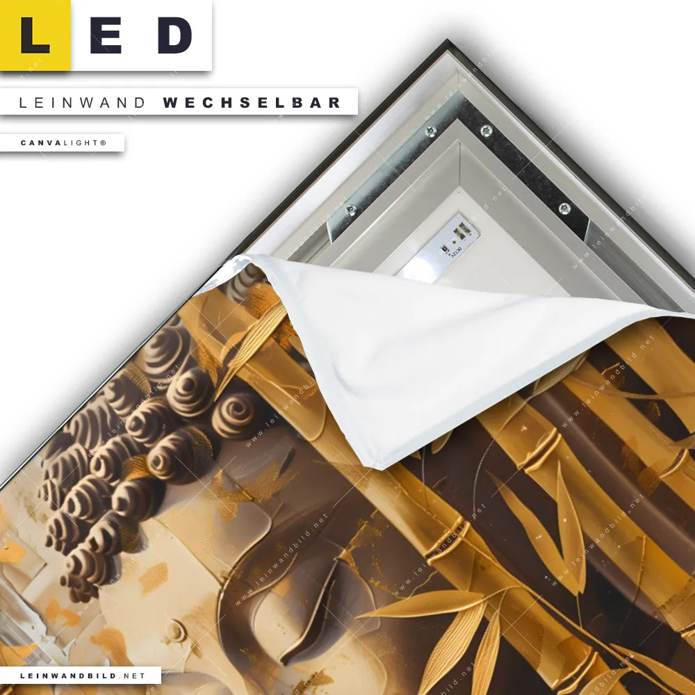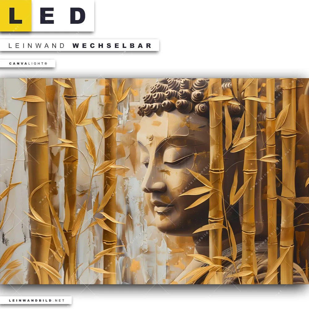 Du bist auf der Suche nach einem Buddha - Feng Shui LED Leinwandbild im Querformat? Begriffe wie Asien, Statue, Bambus, Buddha, Meditation, Buddhismus, Religion, Feng Shui, Zen haben Dich auf der Suche nach Deinem neuen XXL LED Wandbild mit wechselbarer Leinwand inspiriert? Farben wie Gold, Beige, Braun dürfen auf Deinem neuen breiten Leinwand-LED-Bild nicht fehlen und Leuchtbilder im Abstrakt, Mixed Media Stil passen perfekt zu Deinem Einrichtungsstil?