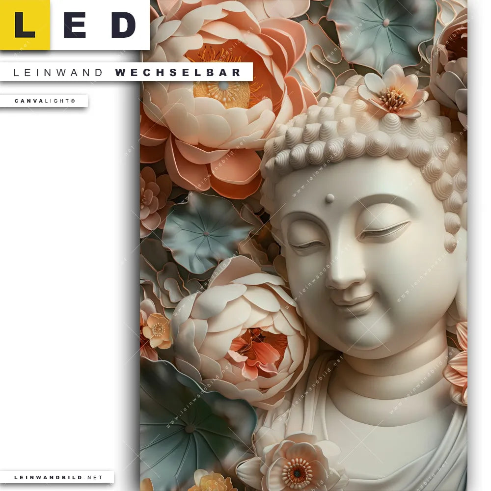 Du bist auf der Suche nach einem Buddha - Feng Shui, Blumen - Botanik LED Leinwandbild im Hochformat? Begriffe wie Blüten, Statue, Spirituell, Buddhismus, Blumen, Buddha, Meditation, Religion haben Dich auf der Suche nach Deinem neuen XXL LED Wandbild mit wechselbarer Leinwand inspiriert? Farben wie Beige, Orange, Blau dürfen auf Deinem neuen Leinwand-LED-Bild nicht fehlen und Leuchtbilder im Floral, Modern Art Stil passen perfekt zu Deinem Einrichtungsstil?
