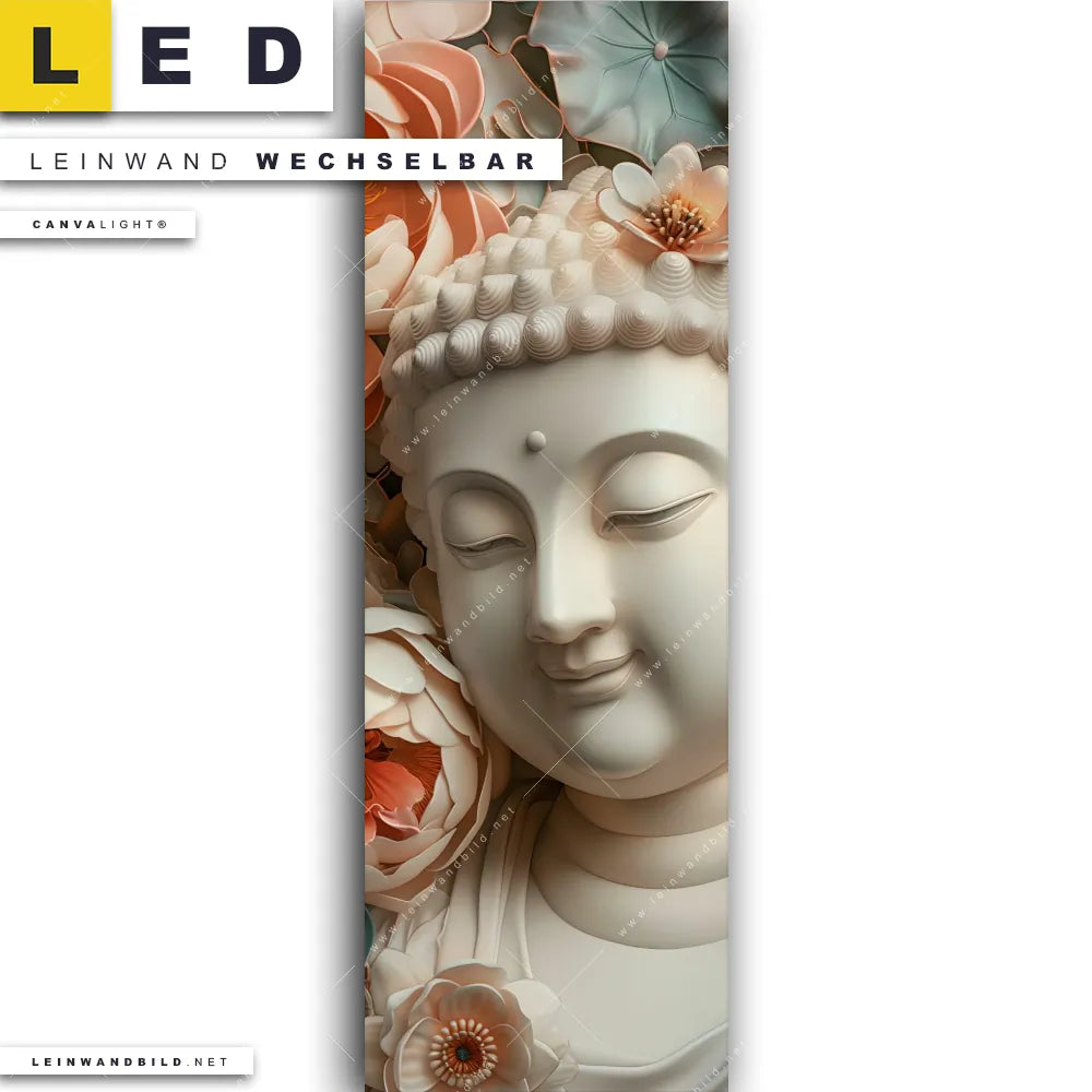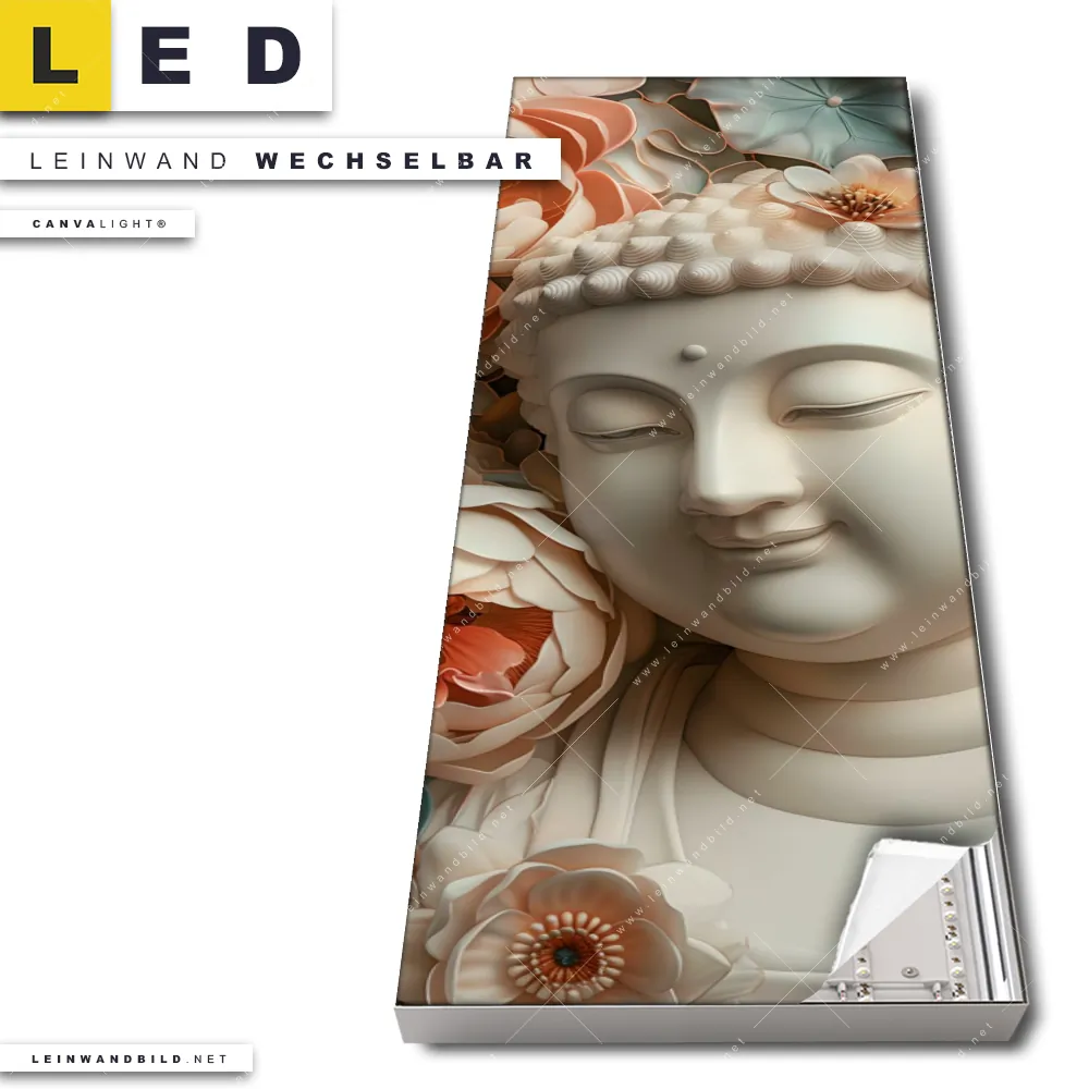 Du bist auf der Suche nach einem Buddha - Feng Shui, Blumen - Botanik LED Leinwandbild im Schmalen Format? Begriffe wie Blüten, Statue, Spirituell, Buddhismus, Blumen, Buddha, Meditation, Religion haben Dich auf der Suche nach Deinem neuen XXL LED Wandbild mit wechselbarer Leinwand inspiriert? Farben wie Beige, Orange, Blau dürfen auf Deinem neuen Leinwand-LED-Bild im Panorama-Hochformat nicht fehlen und Leuchtbilder im Floral, Modern Art Stil passen perfekt zu Deinem Einrichtungsstil?