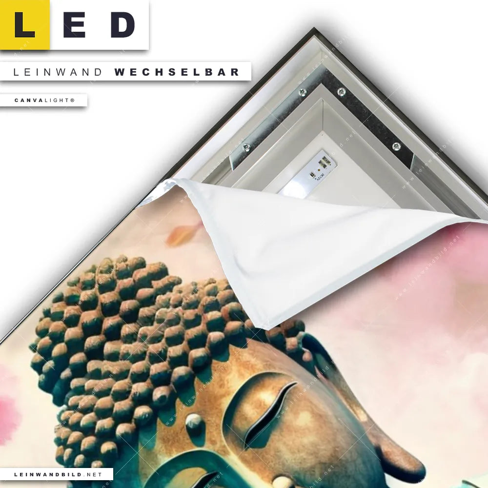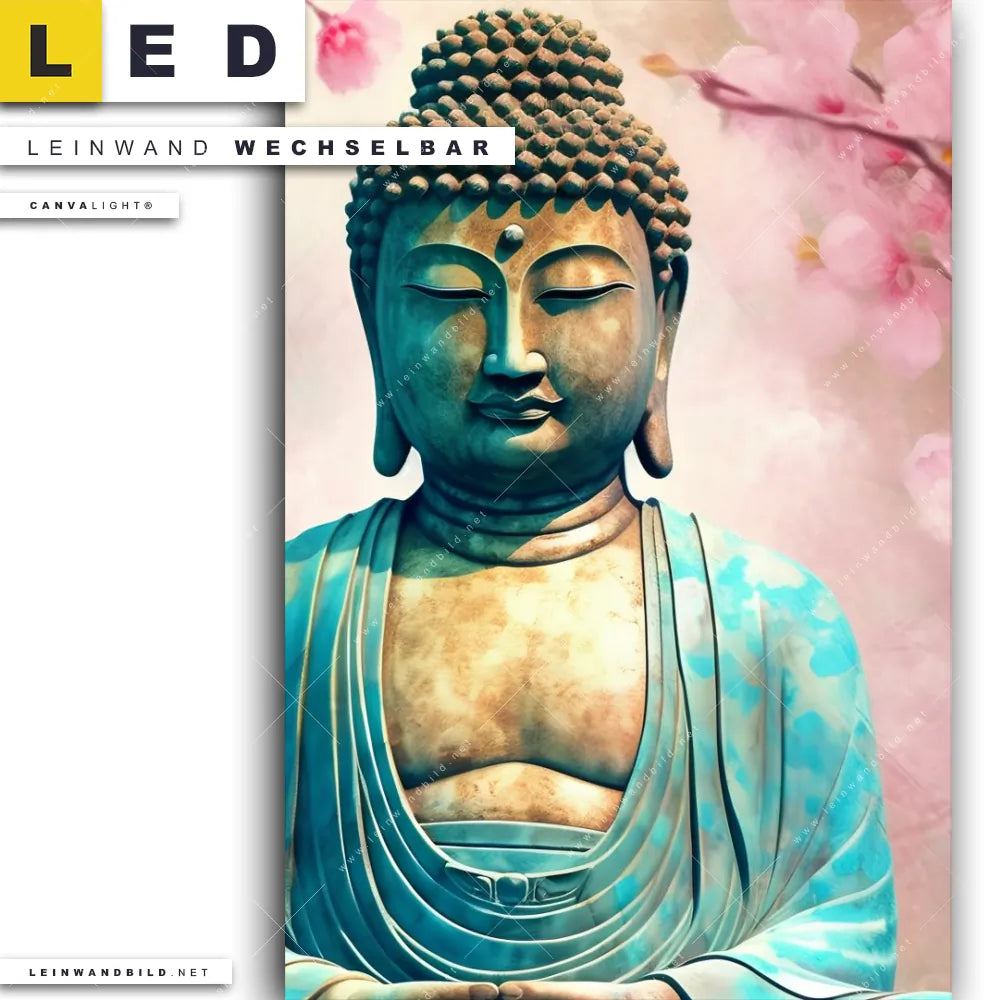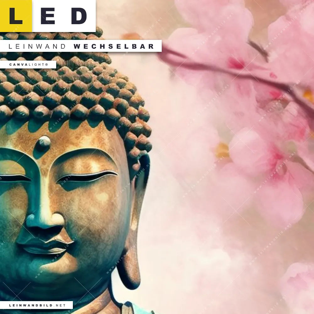 Du bist auf der Suche nach einem Buddha - Feng Shui, Blumen - Botanik LED Leinwandbild im Hochformat? Begriffe wie Buddha, Buddhismus, Meditation, Skulptur, Blüten, Kirschblüten haben Dich auf der Suche nach Deinem neuen XXL LED Wandbild mit wechselbarer Leinwand inspiriert? Farben wie Gold, Orange, Beige dürfen auf Deinem neuen Leinwand-LED-Bild nicht fehlen und Leuchtbilder im Floral, Mixed Media Stil passen perfekt zu Deinem Einrichtungsstil?
