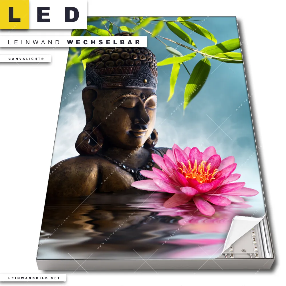 Du bist auf der Suche nach einem Buddha - Feng Shui LED Leinwandbild im Hochformat? Begriffe wie Buddha, Buddhismus, Religion, Feng Shui, Zen, Meditation, Seerose, Blume, Wasser, Bambus haben Dich auf der Suche nach Deinem neuen XXL LED Wandbild mit wechselbarer Leinwand inspiriert? Farben wie Türkis, Pink, Grün, Braun dürfen auf Deinem neuen Leinwand-LED-Bild nicht fehlen und Leuchtbilder im Mixed Media, Floral Stil passen perfekt zu Deinem Einrichtungsstil?