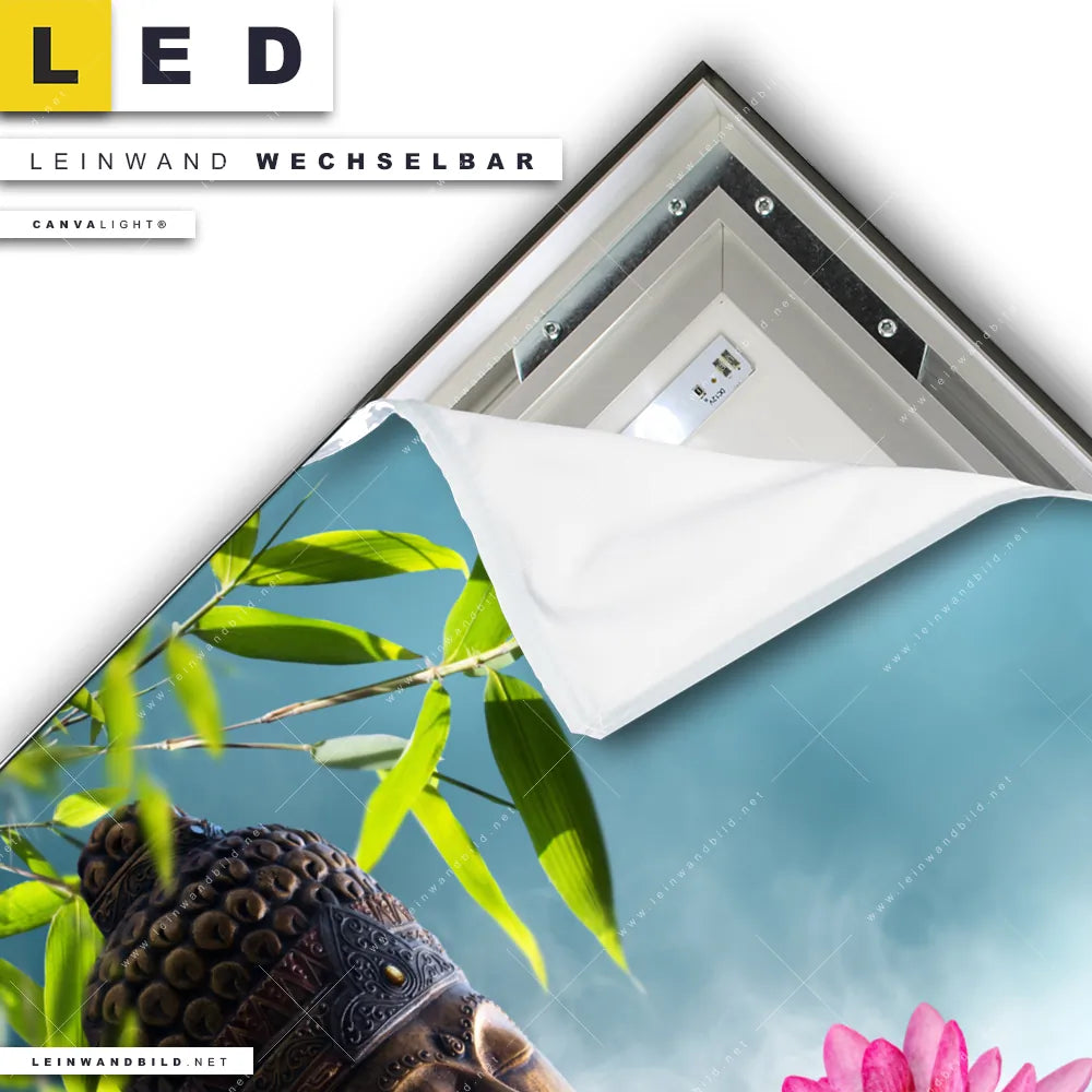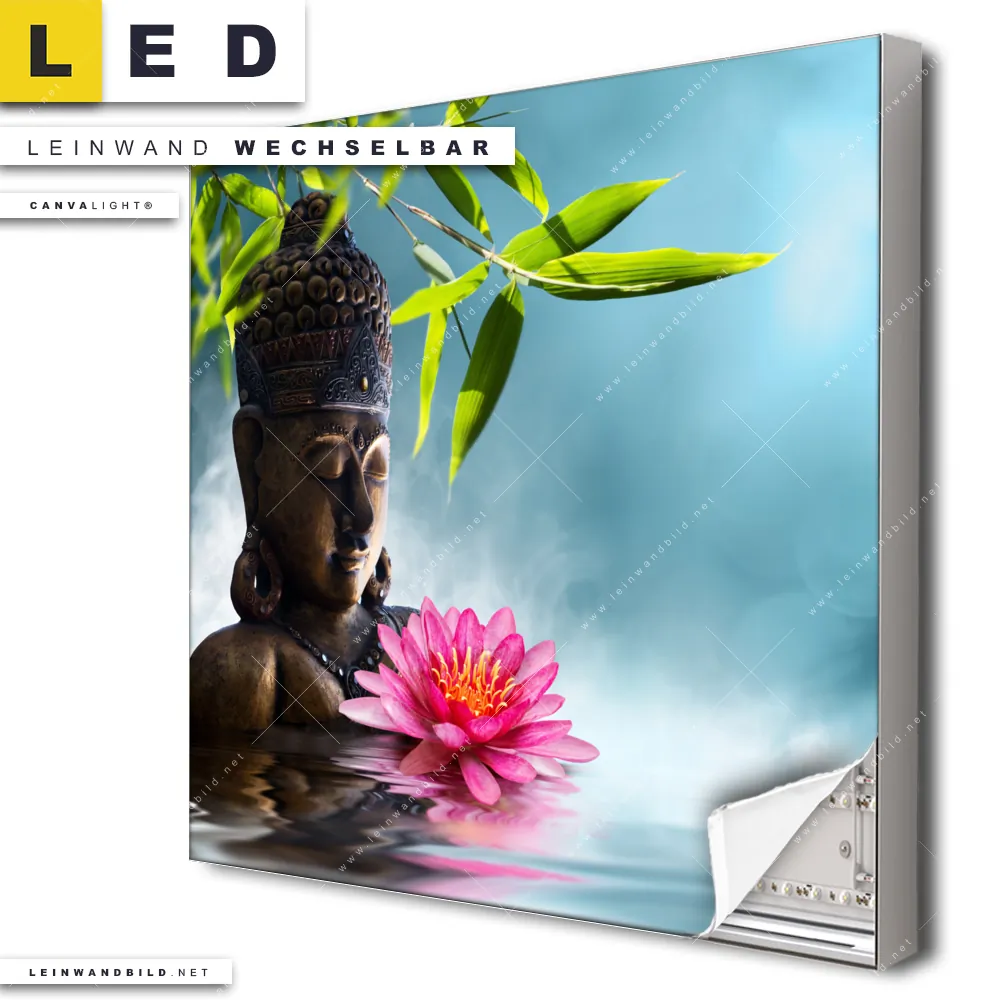 LED Leinwandbild Canvalight® TEX | Buddha Statue mit Seerose | Quadrat