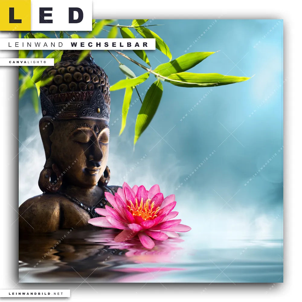 Du bist auf der Suche nach einem Buddha - Feng Shui LED Leinwandbild im Quadratischen Format? Begriffe wie Buddha, Buddhismus, Religion, Feng Shui, Zen, Meditation, Seerose, Blume, Wasser, Bambus haben Dich auf der Suche nach Deinem neuen XXL LED Wandbild mit wechselbarer Leinwand inspiriert? Farben wie Türkis, Pink, Grün, Braun dürfen auf Deinem neuen Leinwand-LED-Bild nicht fehlen und Leuchtbilder im Mixed Media, Floral Stil passen perfekt zu Deinem Einrichtungsstil?